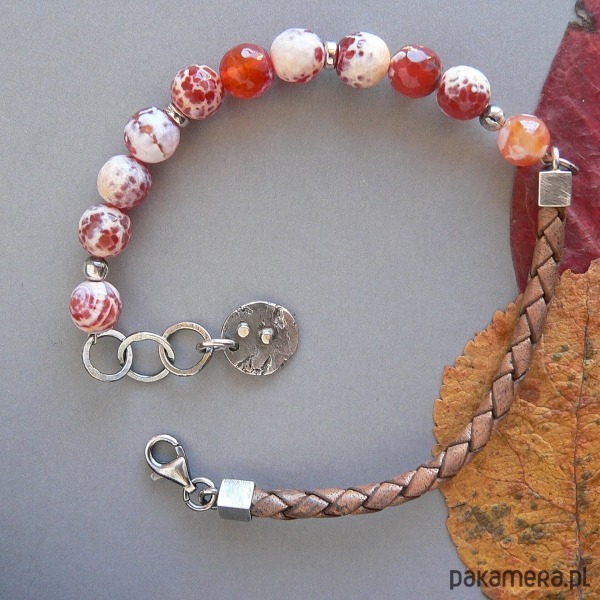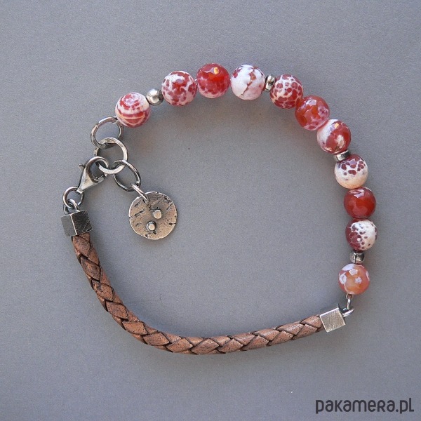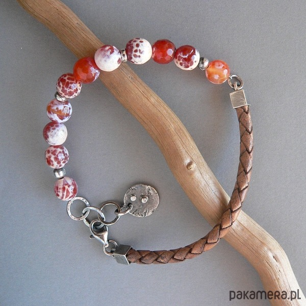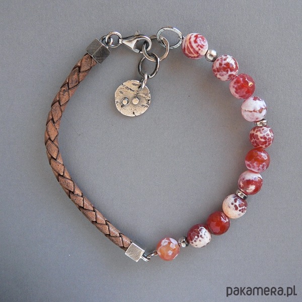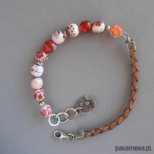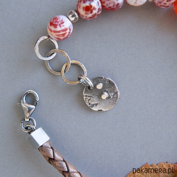 NA ZAMÓWIENIE , TERMIN REALIZACJI 3-4 DNI ROBOCZYCH. wykonana z agatów ,srebra i rzemienia w odcieniu brąz-vintage. Wymiary kamieni 0,8 cm Srebrne elementy mają surową fakturę, oksydowane i polerowane.