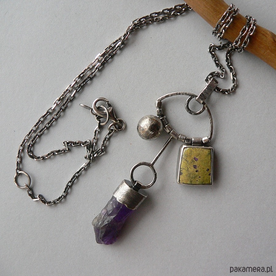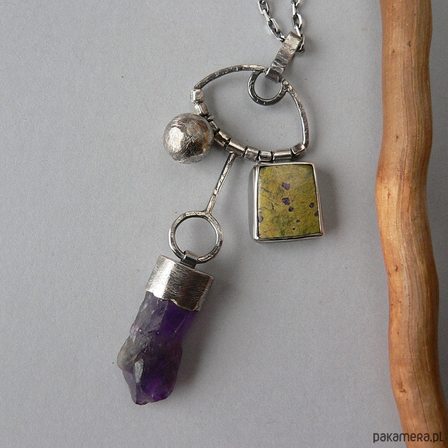 Wisior wykonany ze srebra, sopla surowego, ciemnofioletowego ametystu i atlantysytu w kolorze olwkowym z fioletowymi plamkami. Srebro pokryte wyraźną fakturą, oksydowane, detale polerowane. Wymiary ametystu- 3/1,3 cm, atlantysyt- 1,6/1,4 cm Długość całego elementu ozdobnego 8 cm Całość zawieszona na solidnym , srebrnym łańcuszku o obwodzie 63 cm, wlutowane dodatkowe kółeczko do zapinania na obwodzie 56 cm, łańcuszek można dopasować indywidualnie lub zakupić wisiorek bez łańcuszka, proszę o wiadomość przy zakupie.