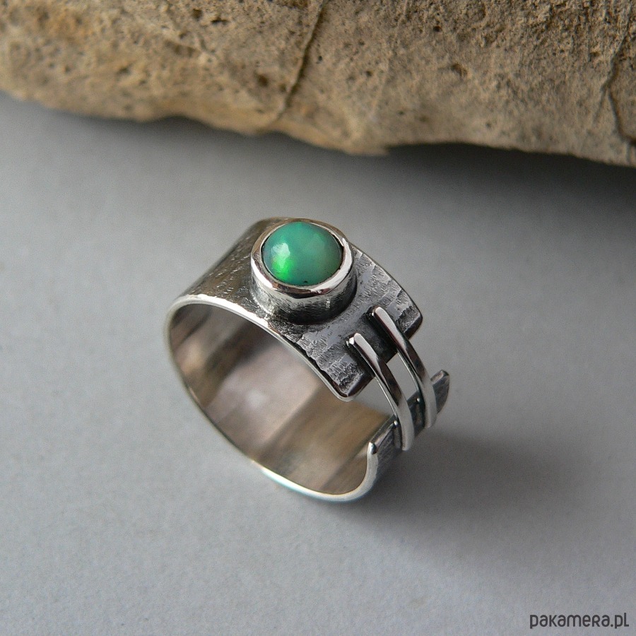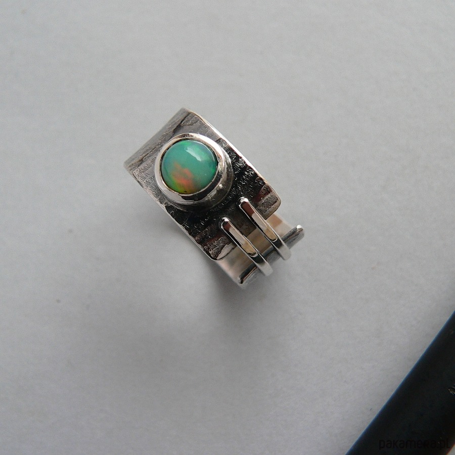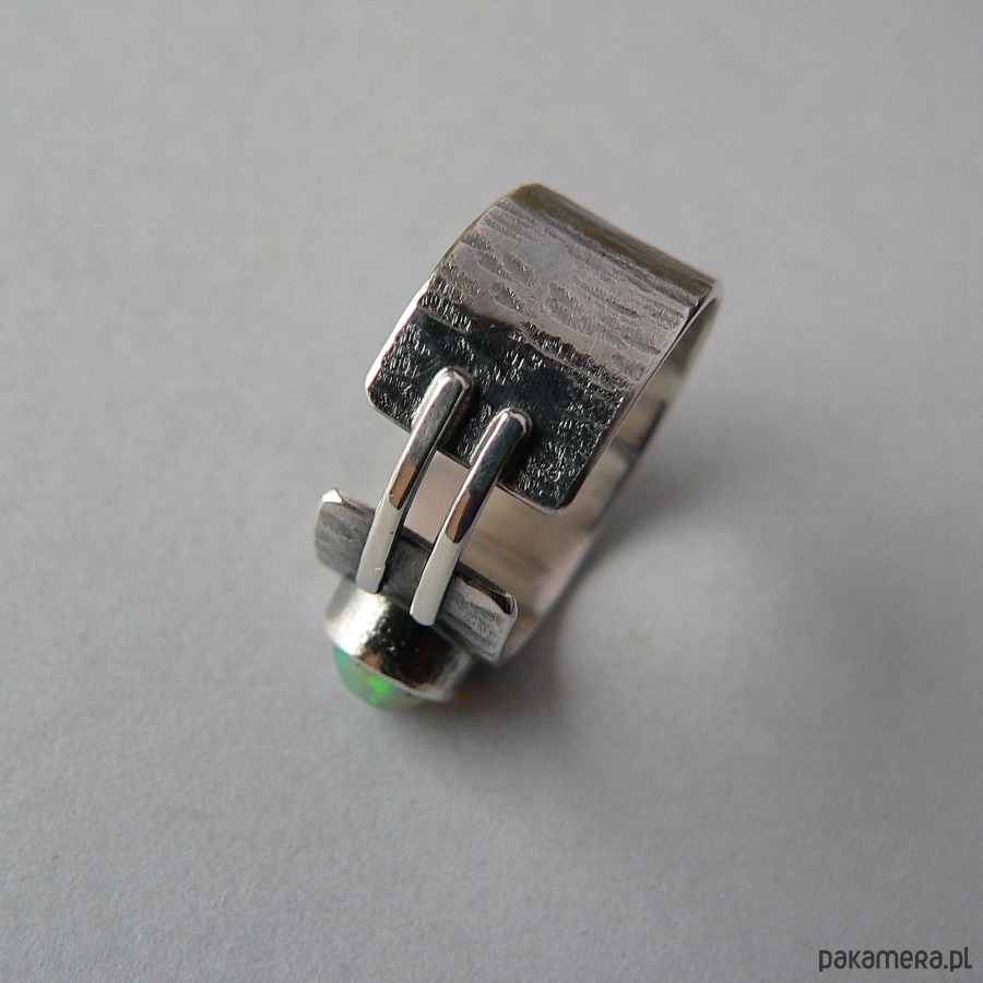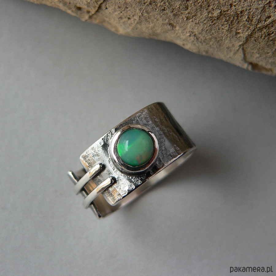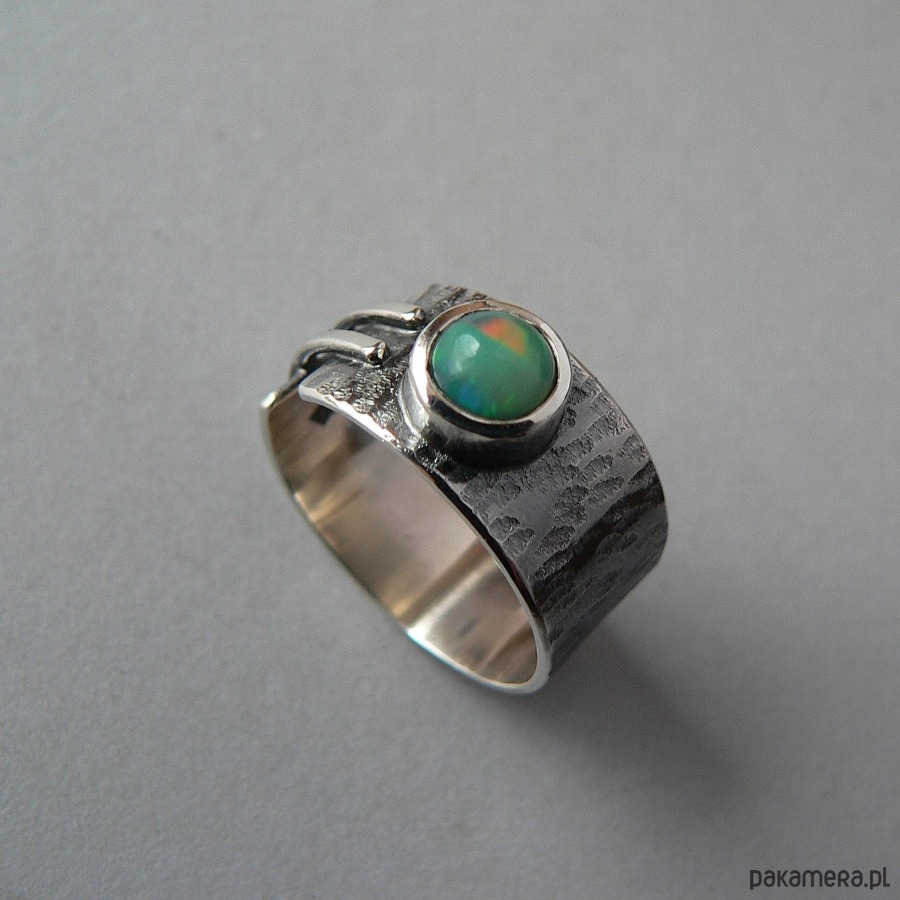 Asymetryczna obrączka wykonana ze srebra i opala etiopskiego. Powierzchnia srebra pokryta wyraźną fakturą, całość oksydowana, detale polerowane. Średnica opala 7 mm, barwa zielona z mgiełką i refleksami w czerwonym odcieniu. Szerokość obrączki 1 cm Obrączka pasuje na palec w rozmiarze 17-17,5