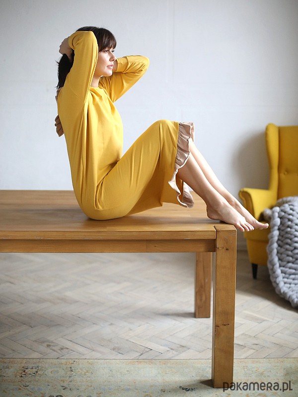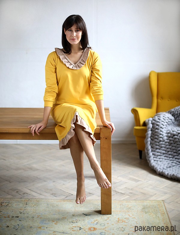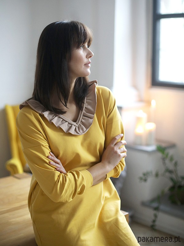 Bluzo sukienka w rozświetlającym kolorze. Jest wykończona falbankami, długa i oversizowa, Jest super wygodna i praktyczna. Dekolt obszyty falbanką możesz nosić z tyłu lub z przodu. Jest dostosowany tak, aby nie było widać zapięcia od stanika i nie jest zbyt wycięty jeśli nosisz go z przodu, abyś czuła się komfortowo. Sukienka wykonana jest z wysokiej jakości cieplutkiej dzianiny. Cudownie jest ją założyć po kąpieli na gołe ciało i otulić się jak szlafrokiem. Zainspiruj się!