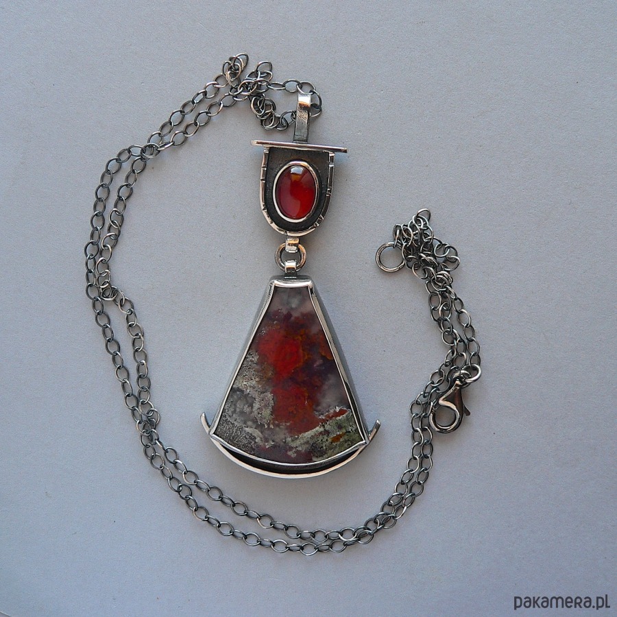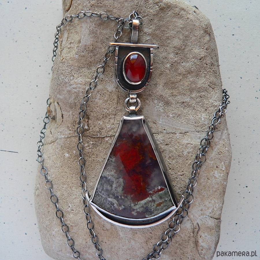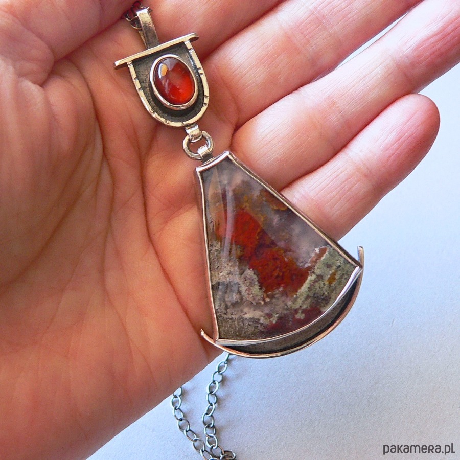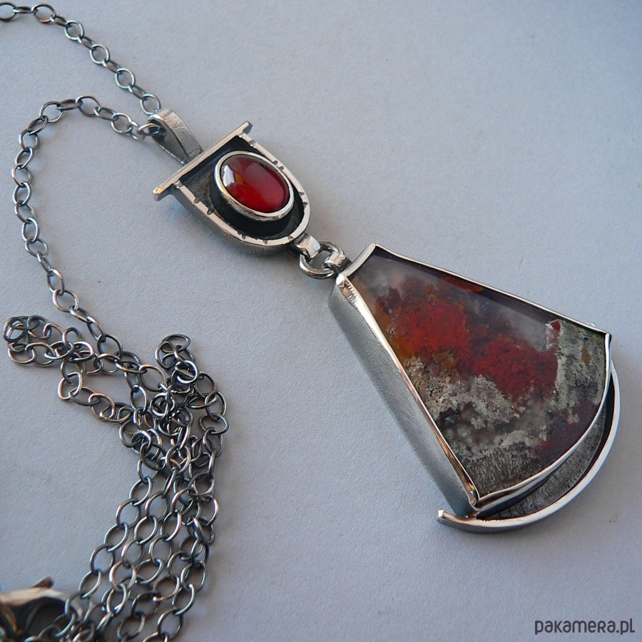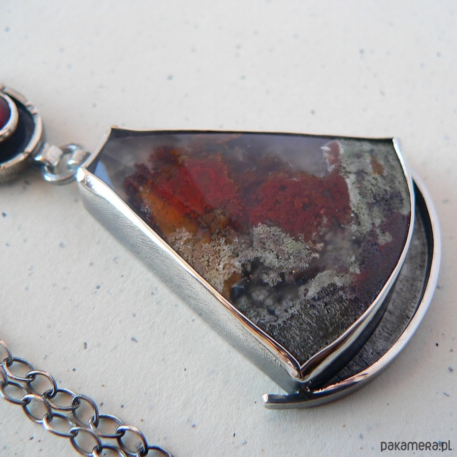 Wisiorek, którego sercem agat mszysty z Indonezji o bardzo interesującym wnętrzu . Towarzystwa dotrzymuje mu owalny granat w kolorze wina. Kamienie oprawione w oksydowane srebro, które pięknie podkreśla barwę kamieni. Wymiary kamieni- granat 12/8 mm średnicy, agat 3,9/3,3 cm Długość całego elementu/wisiorka 8 cm Obwód łańcuszka- 68 cm, możliwość skrócenia łańcuszka lub zakupu bez łańcuszka, proszę o wiadomość przed! zakupem.