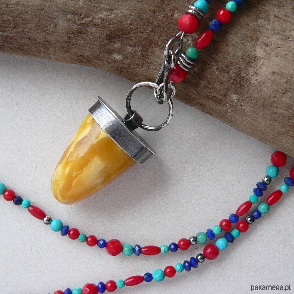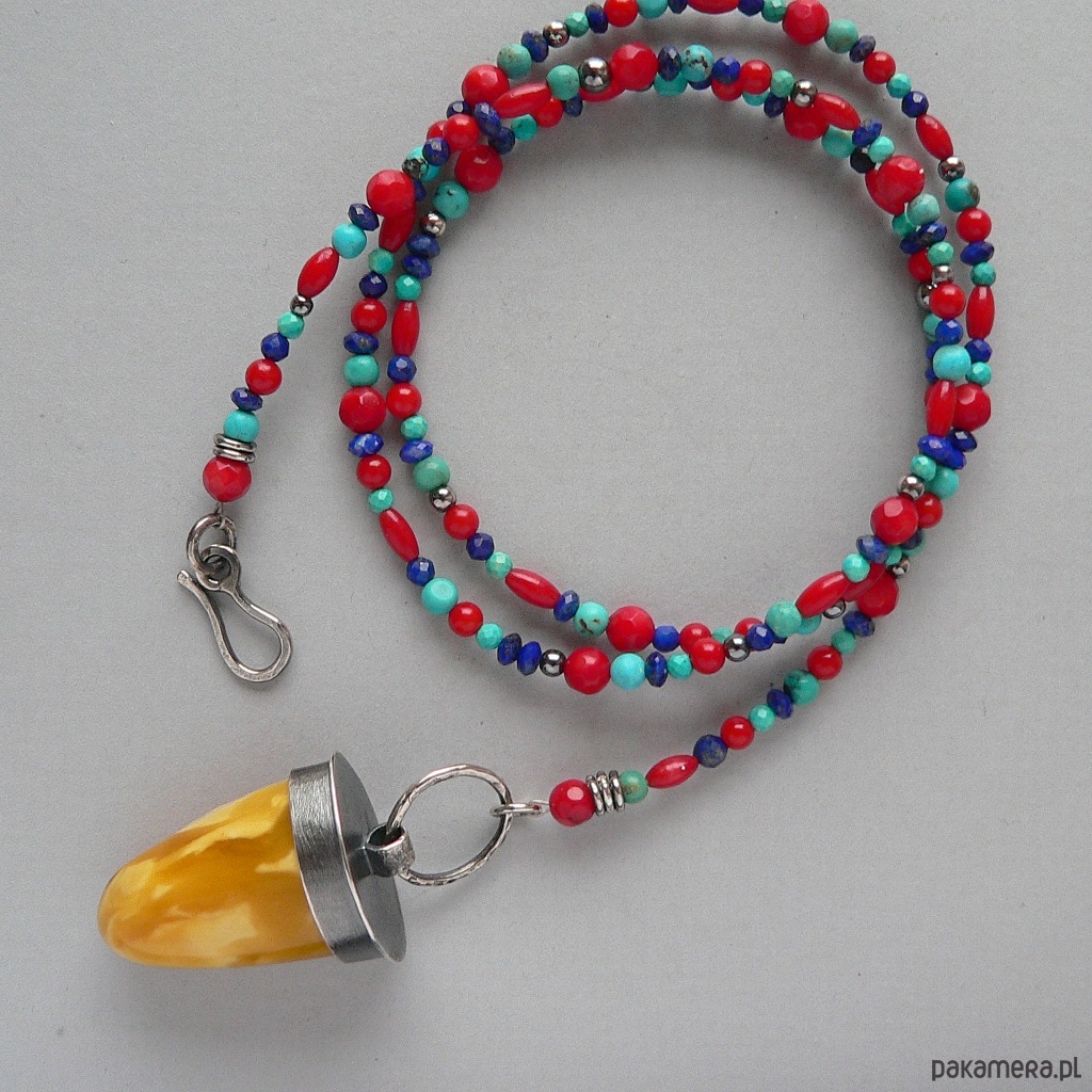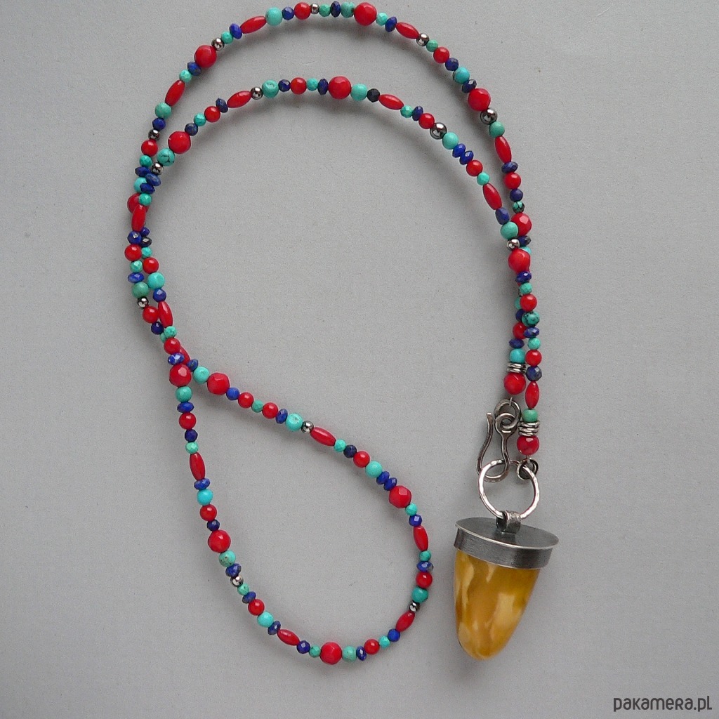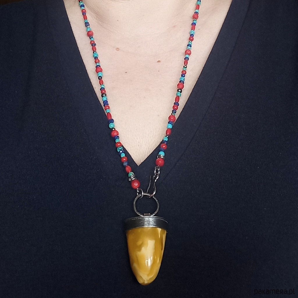 Piękny kolorystycznie, okaz bursztynu bałtyckiego zawieszony na koralikach wykonanych z naturalnych kamieni: lapis lazuli, turkus i czerwony koral. Średnica kamieni od 5-3 mm Wymiary bursztynu- dł. 3 cm, średnica 1,7 cm Obwód korali 64 cm + 5 cm element z bursztynem.
