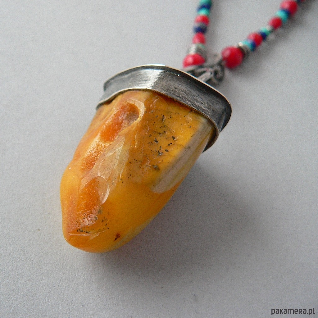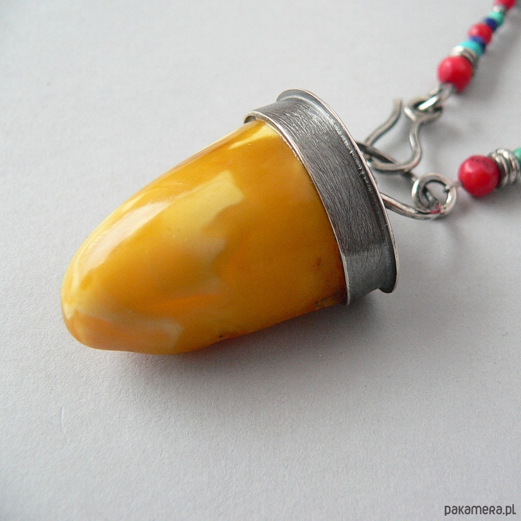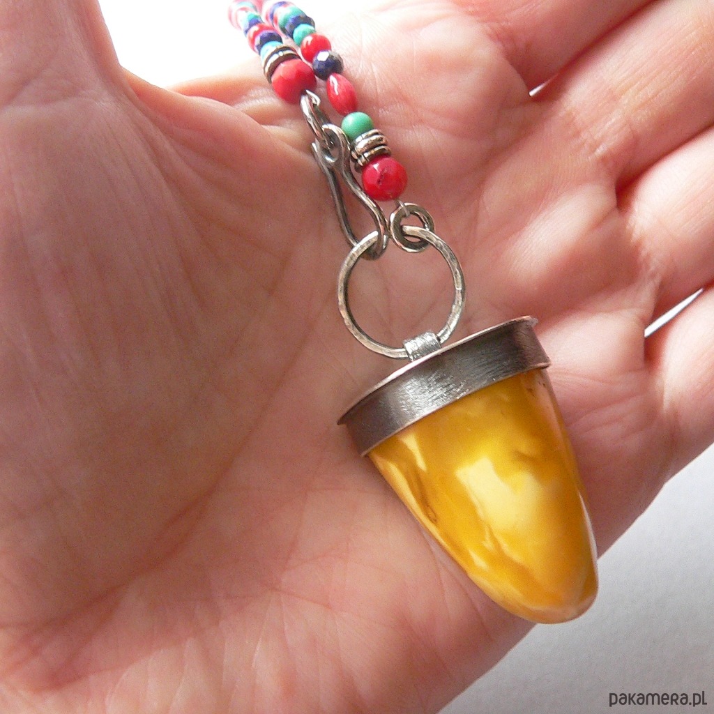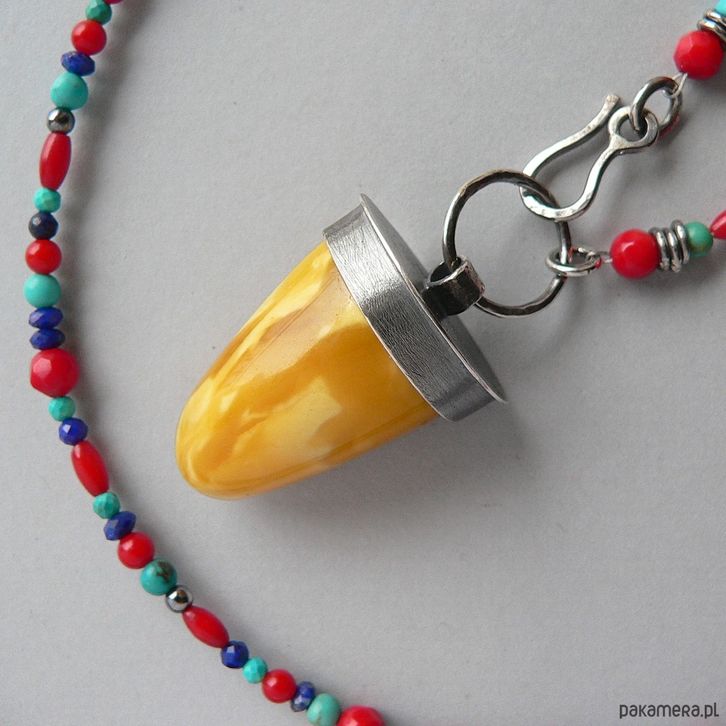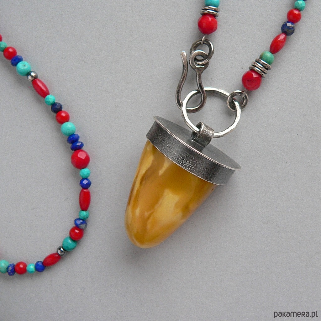 Piękny kolorystycznie, okaz bursztynu bałtyckiego zawieszony na koralikach wykonanych z naturalnych kamieni: lapis lazuli, turkus i czerwony koral. Średnica kamieni od 5-3 mm Wymiary bursztynu- dł. 3 cm, średnica 1,7 cm Obwód korali 64 cm + 5 cm element z bursztynem.