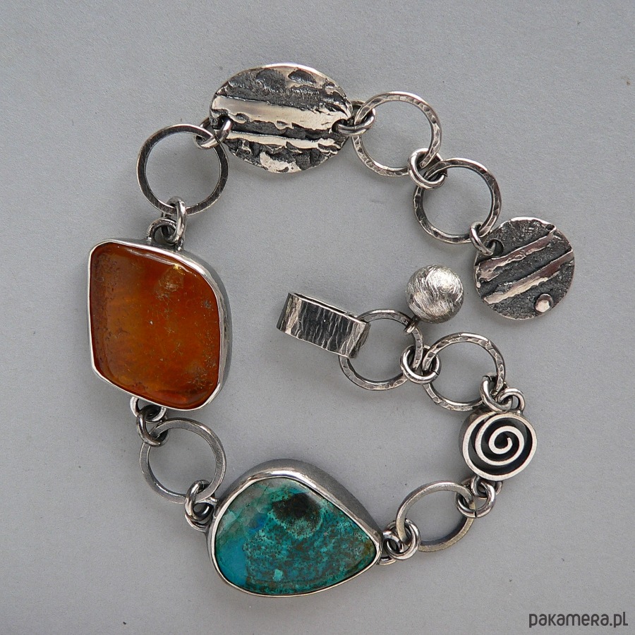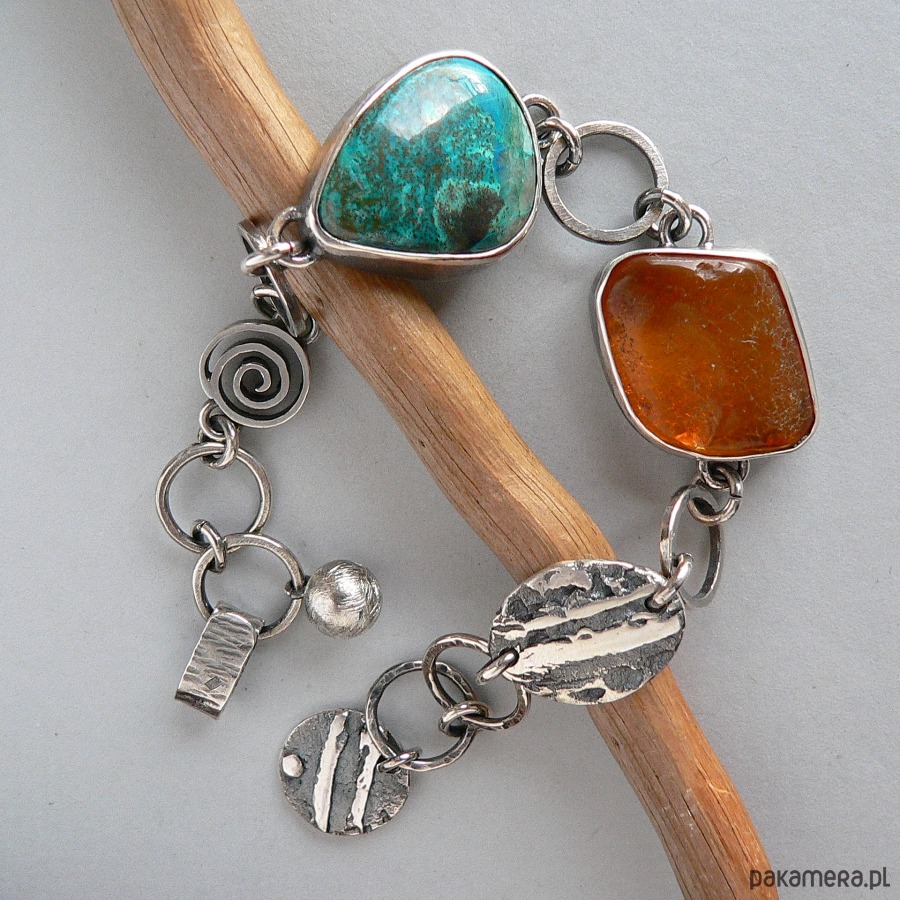 Surowa bransoletka wykonana z kutego, ręcznie wykonanych srebrnych, surowych elementów/ślimak, kulka 1 cm, elementy formowane ogniem/, naturalnej bryłki bursztynu bałtyckiego i chryzokoli . Całość oksydowana i polerowana. Bransoletka pasuje na nadgarstek o obwodzie 16,5-17 cm Wymiary bursztynu- 2/2,2 cm, chryzokola- 2,5/2 cm, wielkość ogniw 1,3 cm Łatwe w samodzielnej obsłudze zapięcie haczykowe.