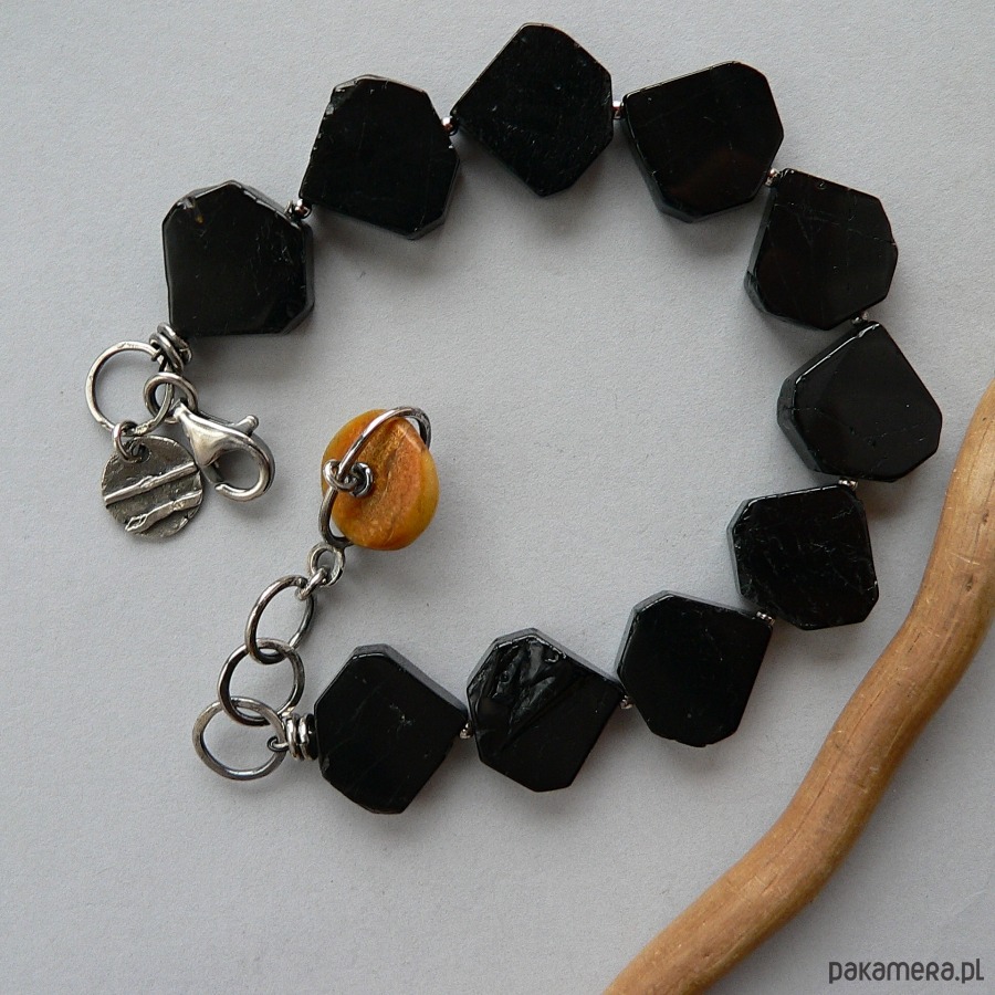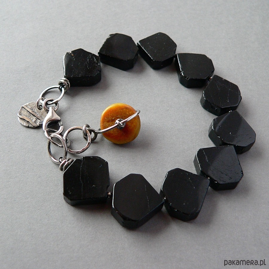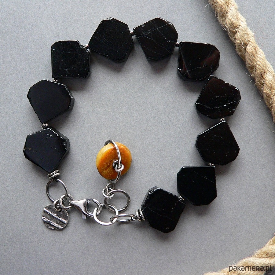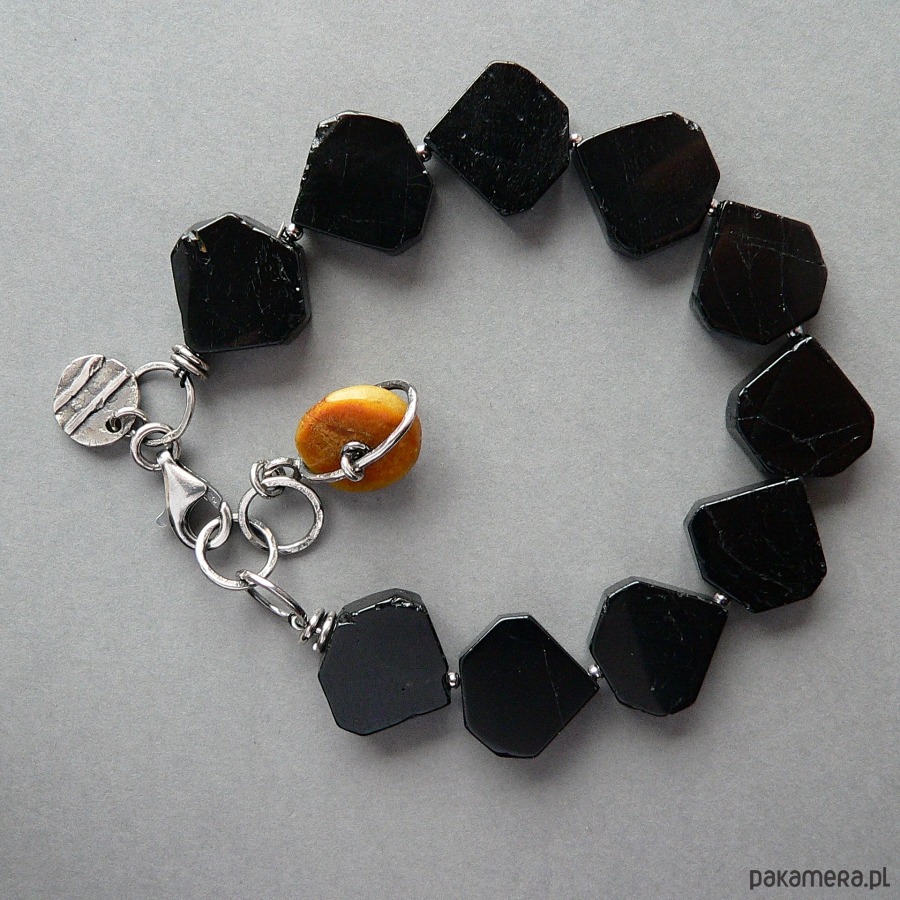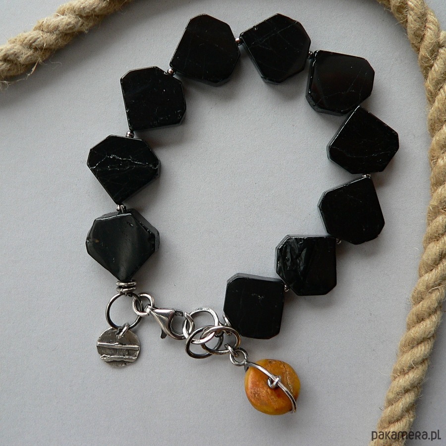 Bransoletka wykonana czarnych turmalinów, bursztynu i srebra. Srebro fakturowane, oksydowane, detale polerowane. Wymiary płytki turmalinu- 1,7/1,6/0,4 cm, średnica bursztynu 1,6 cm Bransoletka pasuje na nadgarstek o obwodzie 17-18,5 cm