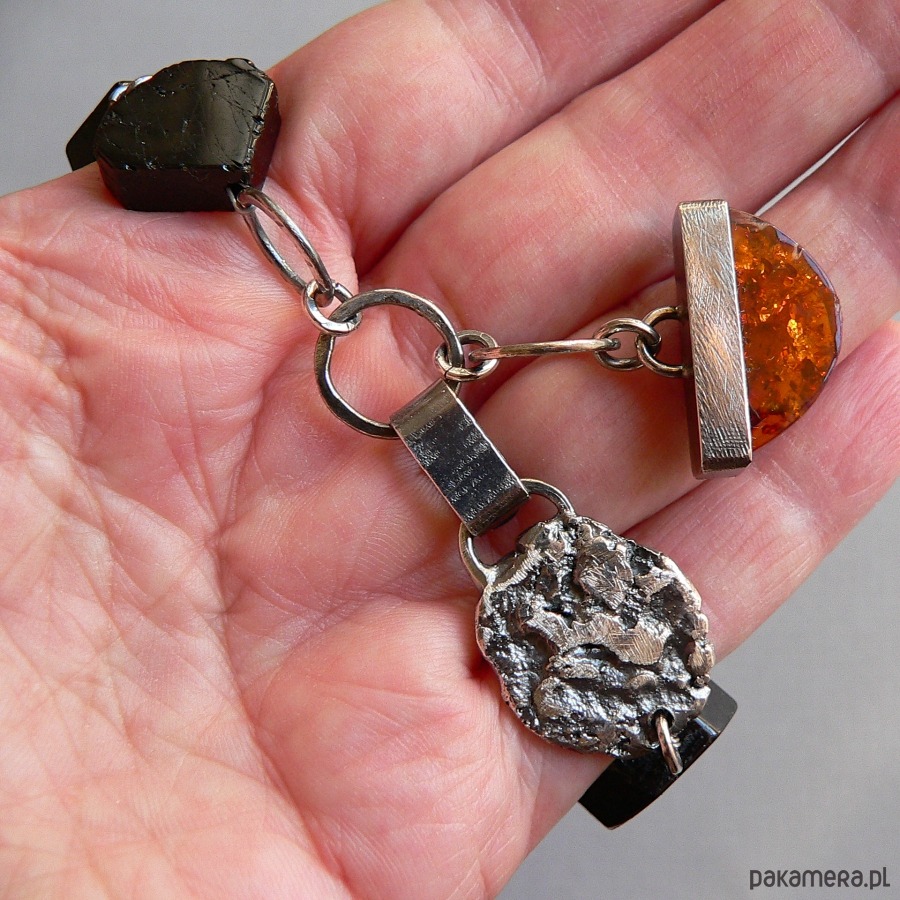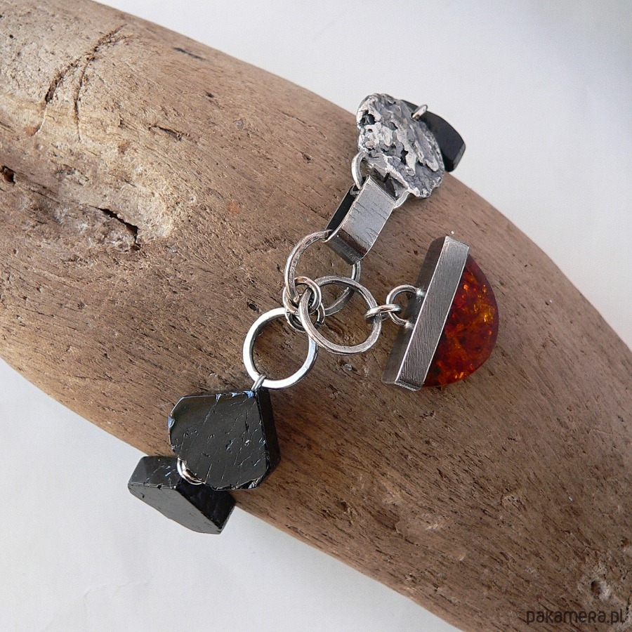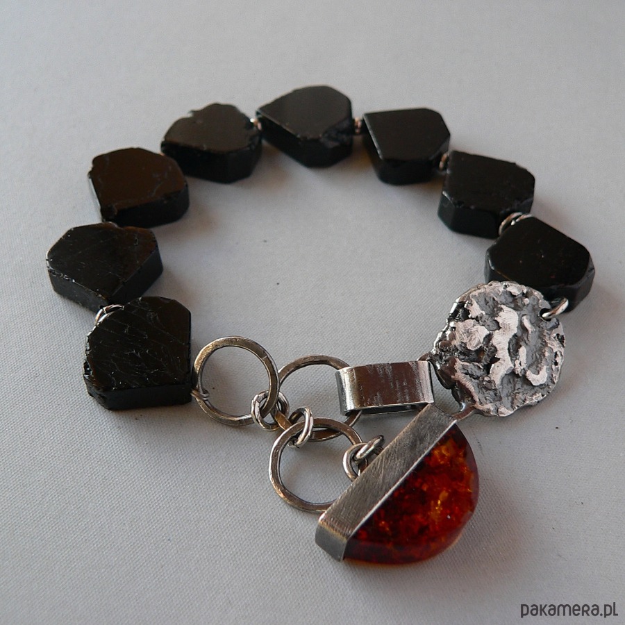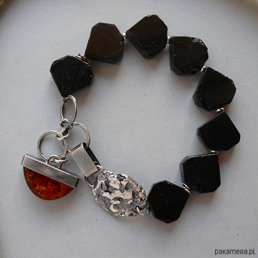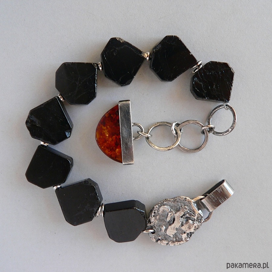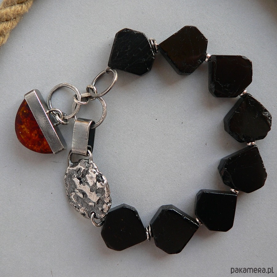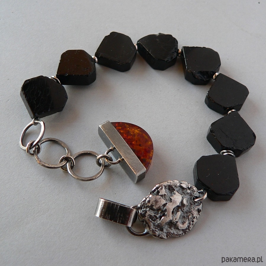 Bransoletka wykonana czarnych turmalinów, koniakowego bursztynu i srebra. Srebro fakturowane, oksydowane, detale polerowane. Wymiary płytki turmalinu- 1,7/1,6/0,4 cm, wymiary bursztynu 1,3/2,3 cm, wymiary surowego elementu formowanego ogniem- 1,8/2,1 cm Bransoletka pasuje na nadgarstek o obwodzie 17-18,5 cm Wygodne w samodzielnej obsłudze zapięcie.