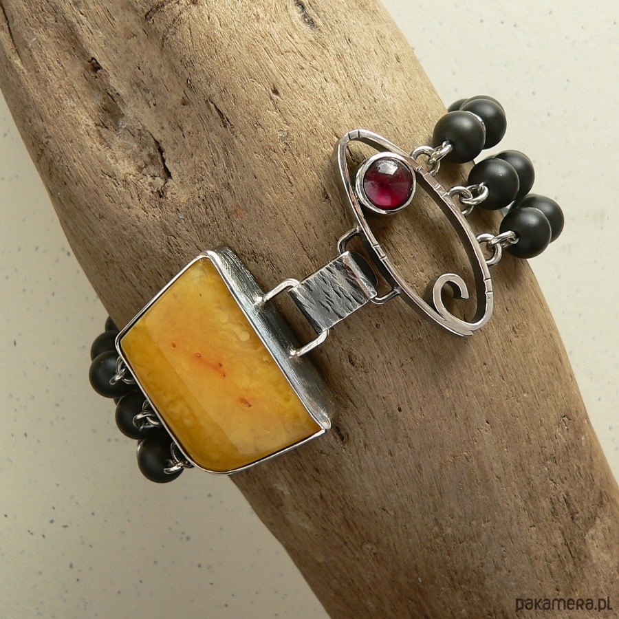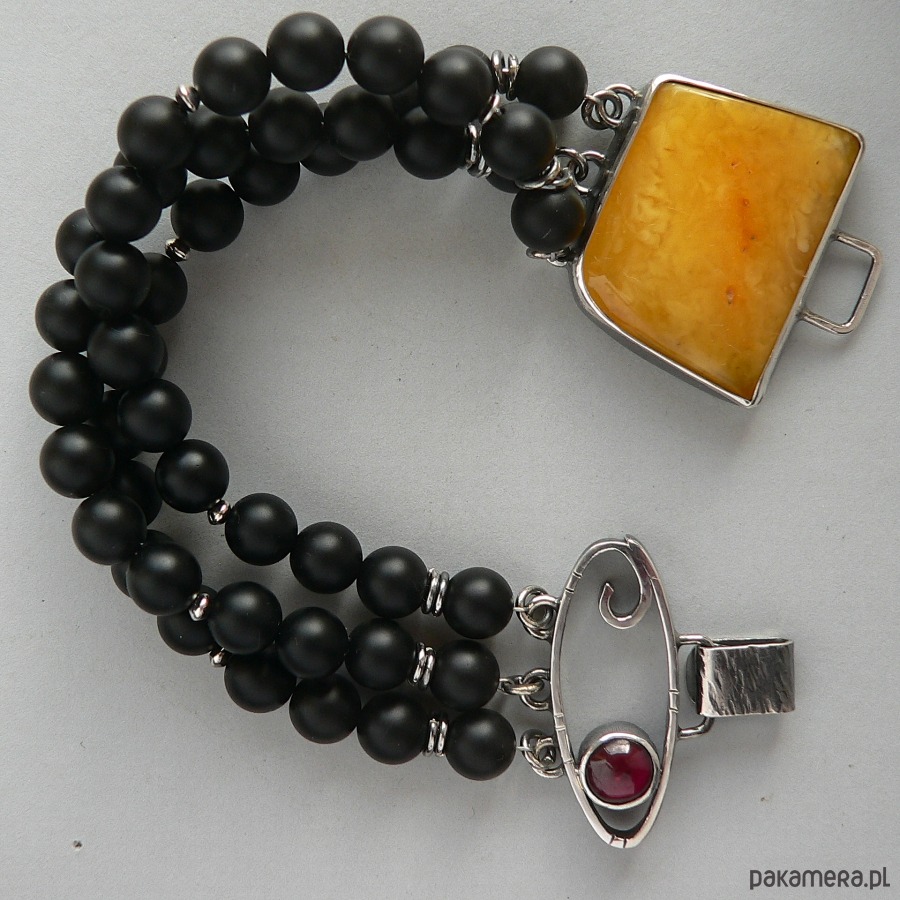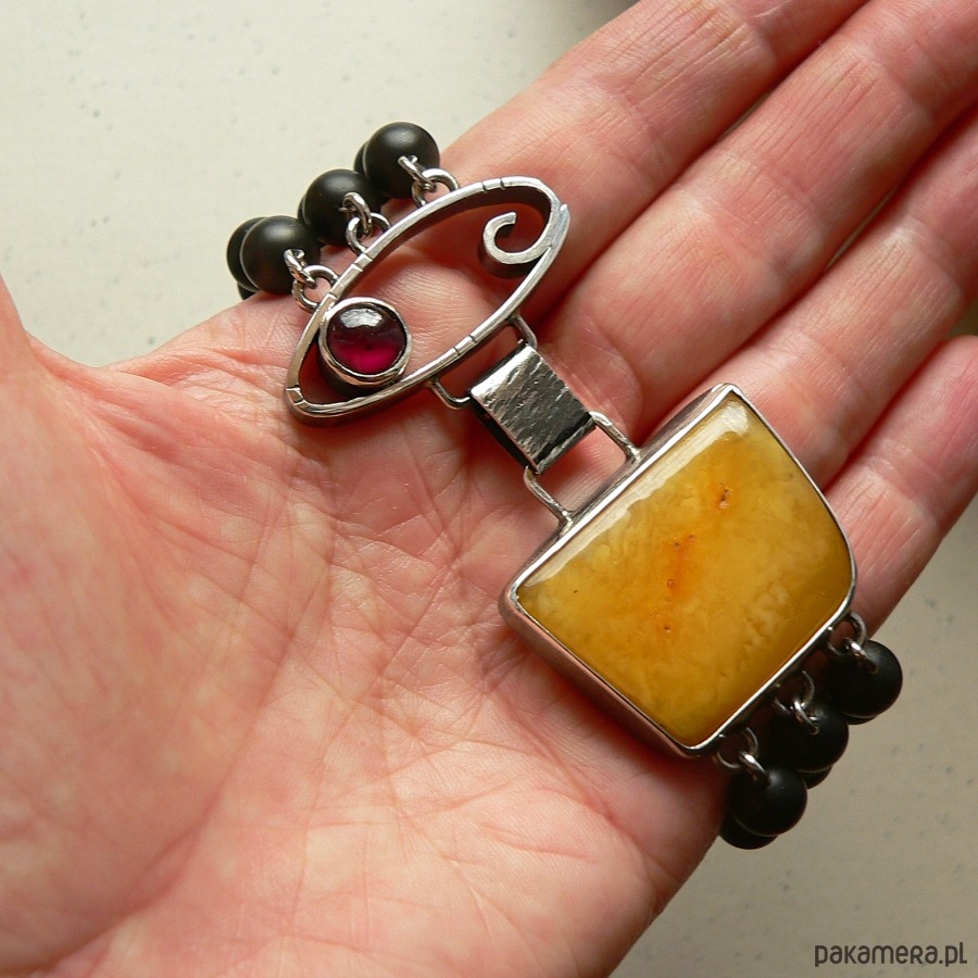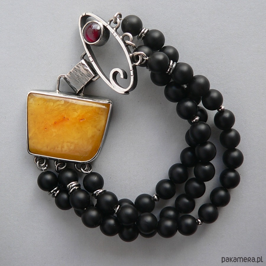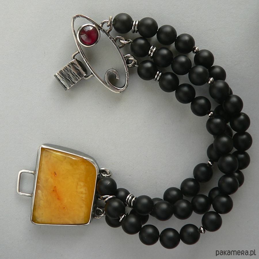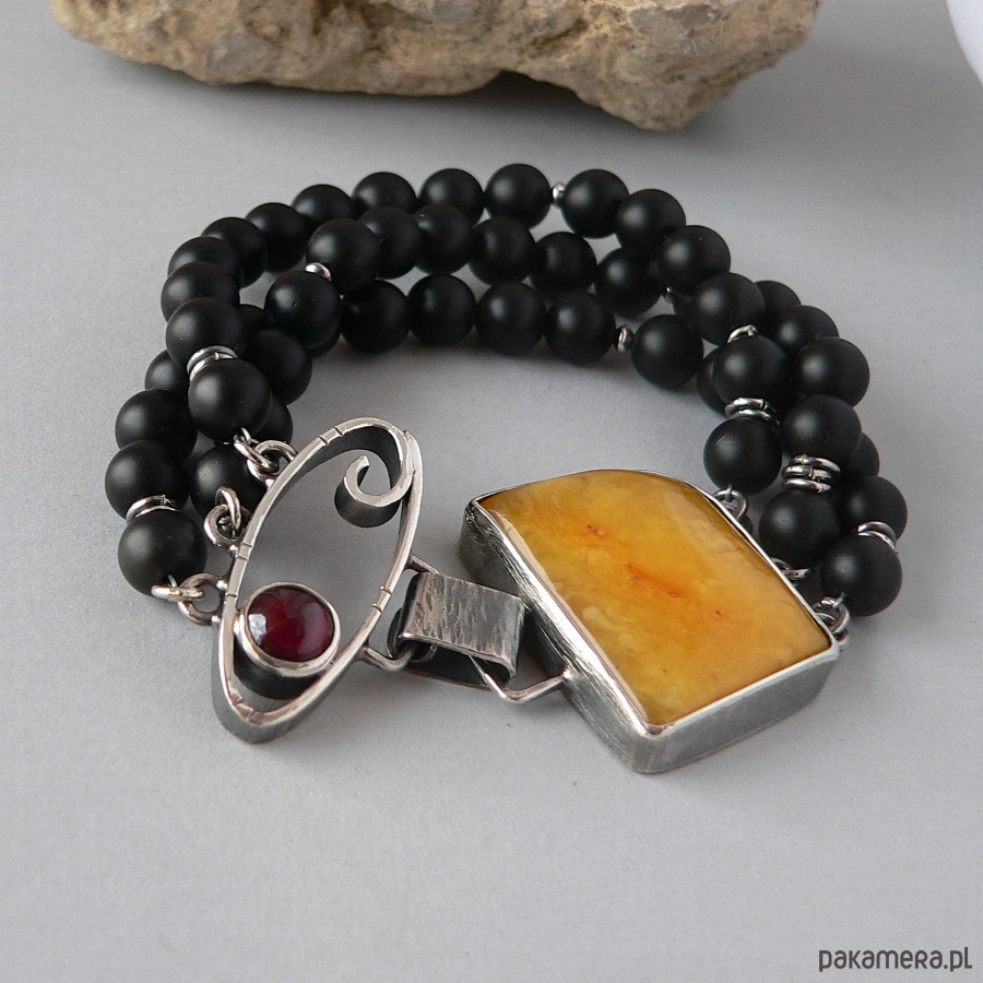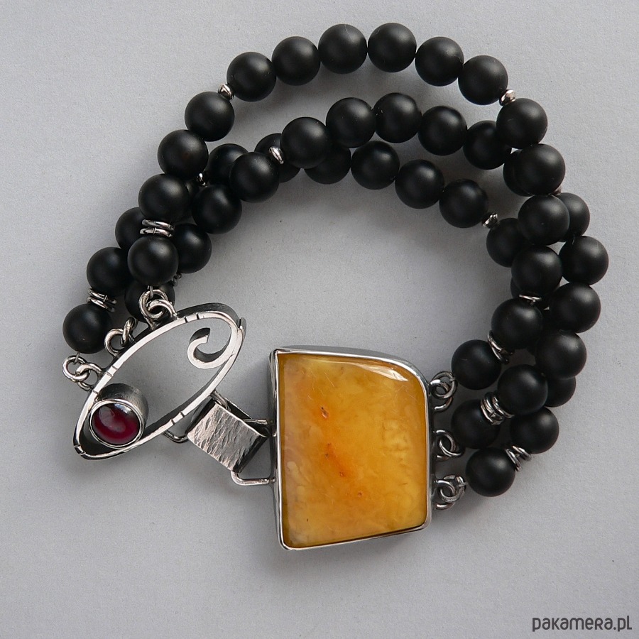 Masywna, okazała bransoleta wykonana ze srebra, naturalnego, bałtyckiego bursztynu, półmatowych onyksów i granatu. Srebro fakturowane i oksydowane. Błyszczące detale znakomicie kontrastują z eleganckimi onyksami o półmatowym wykończeniu. Średnica onyksów- 8 mm, wymiary bursztynu- 3,4/2,8 cm , wymiary elementu zdobionego granatem 3,6/1,8 cm, granat- 0,8 cm Bransoletka pasuje na nadgarstek o obwodzie 17,5-18 cm Bursztyn posiada naturalne wżerki na powierzchni.