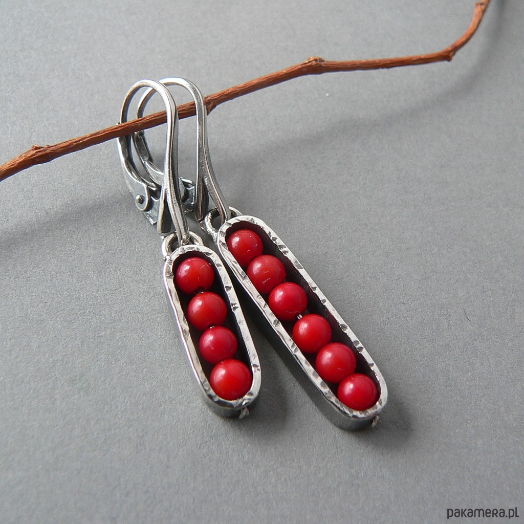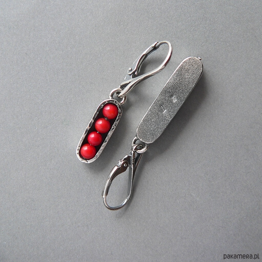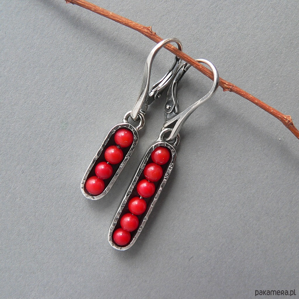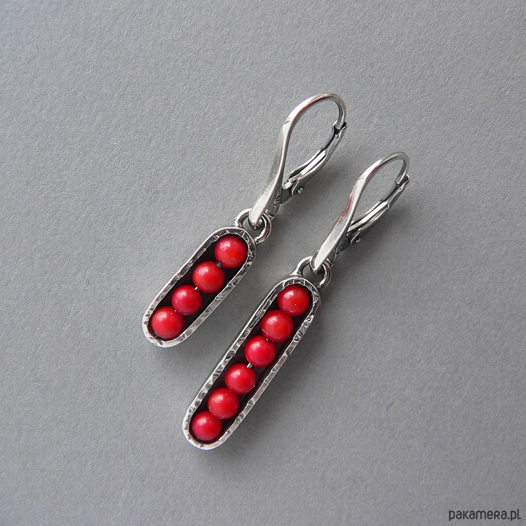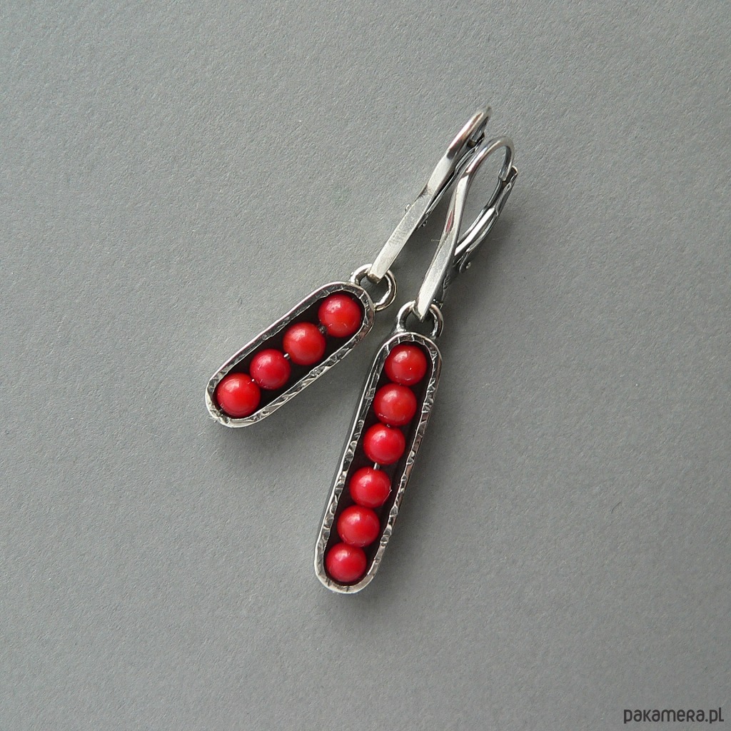 Asymetryczne, nieduże kolczyki wykonane z drobnych kulek korala /3 mm/ i srebra. Srebro pokryte wyraźną fakturą, oksydowane, detale polerowane. Wygodne w obsłudze i bezpieczne bigle. Długość kolczyków 4 i 4,7 cm, szerokość 7 mm