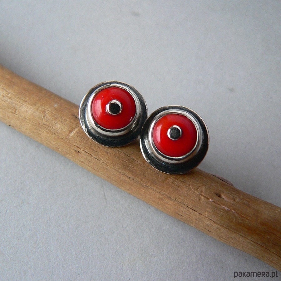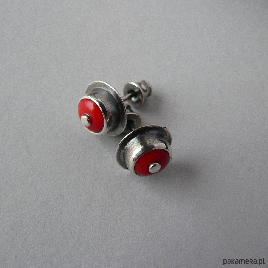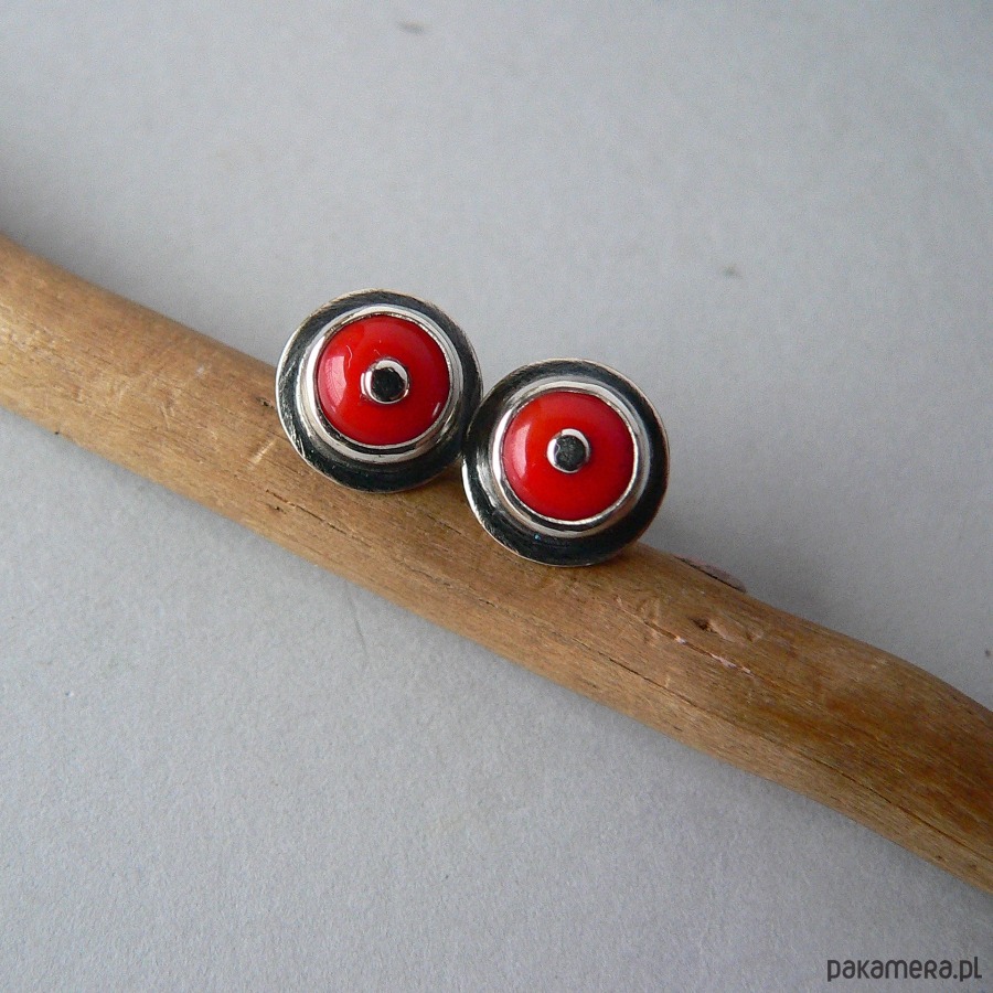 Kolczyki na sztyftach wykonane własnoręcznie ze srebra i korala. Srebro drapane, oksydowane i polerowane. Średnica kamienia-8 mm, średnica srebrnego krążka-11 mm