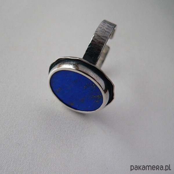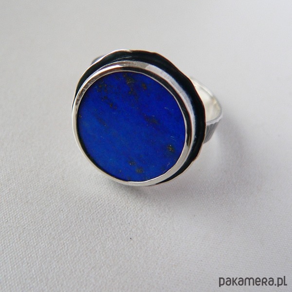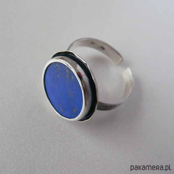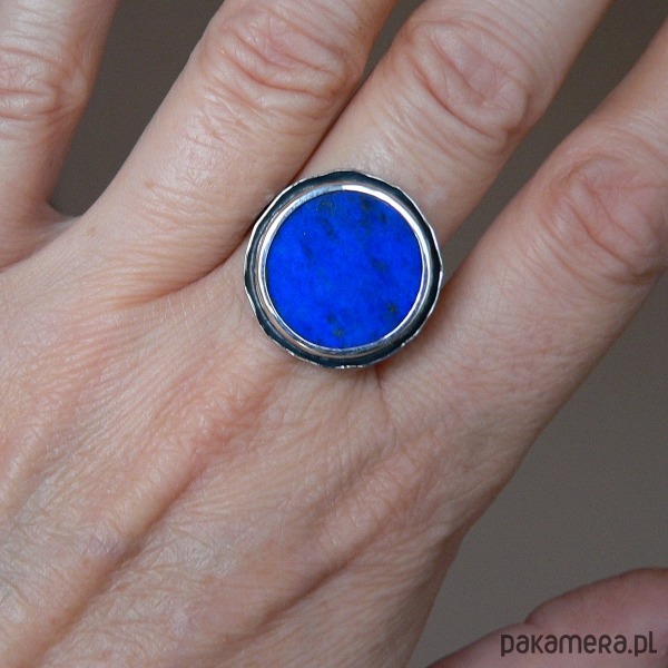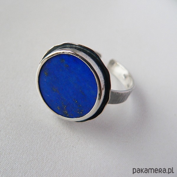 Pierścionek wykonany ze srebra i lapis lazuli. Średnica kamienia- 20 mm , kamień w modrakowym odcieniu, nakrapiany. Srebro fakturowane i oksydowane. Obrączka regulowana w szerokim zakresie, przy zakupie proszę o podanie noszonego rozmiaru, ustawię obrączkę.