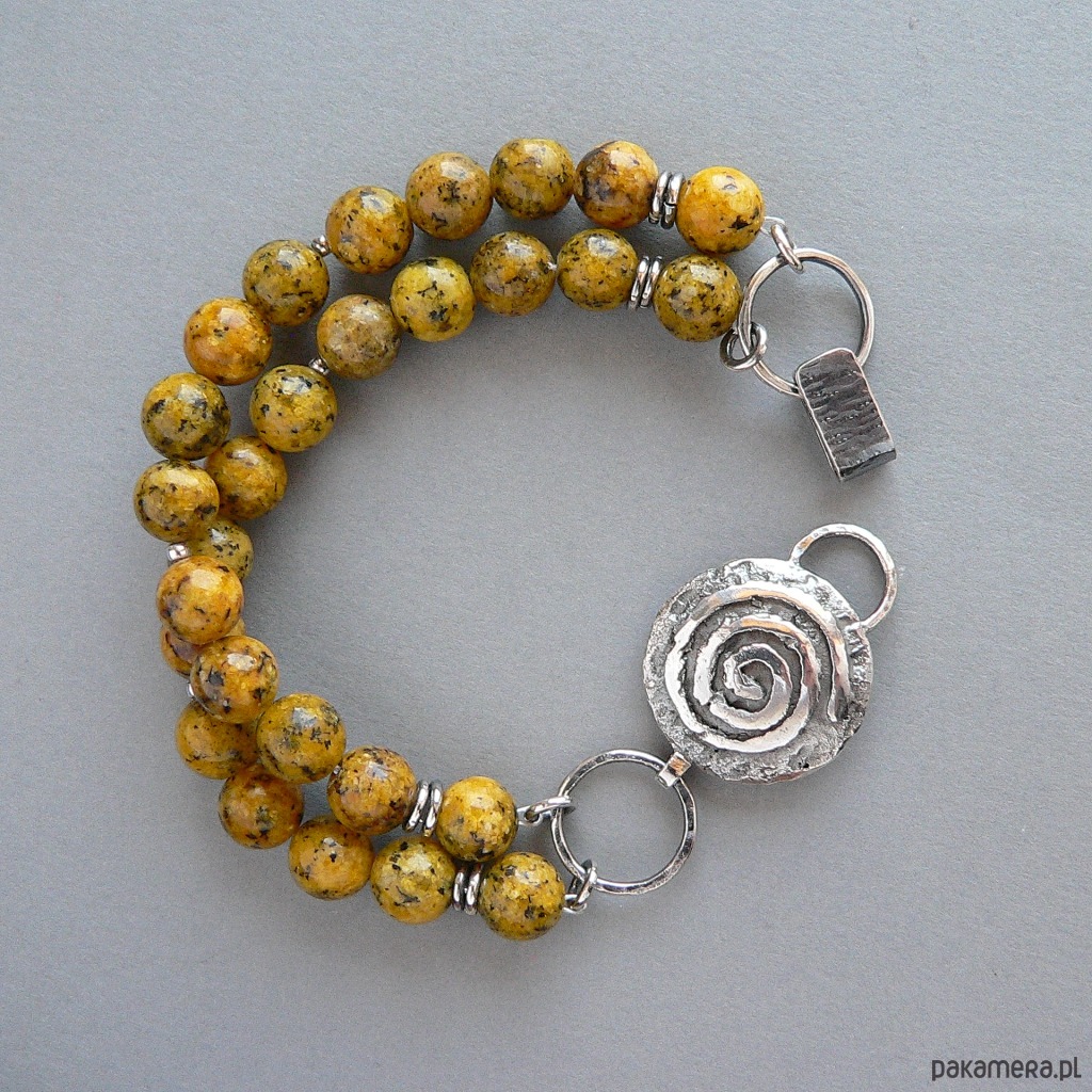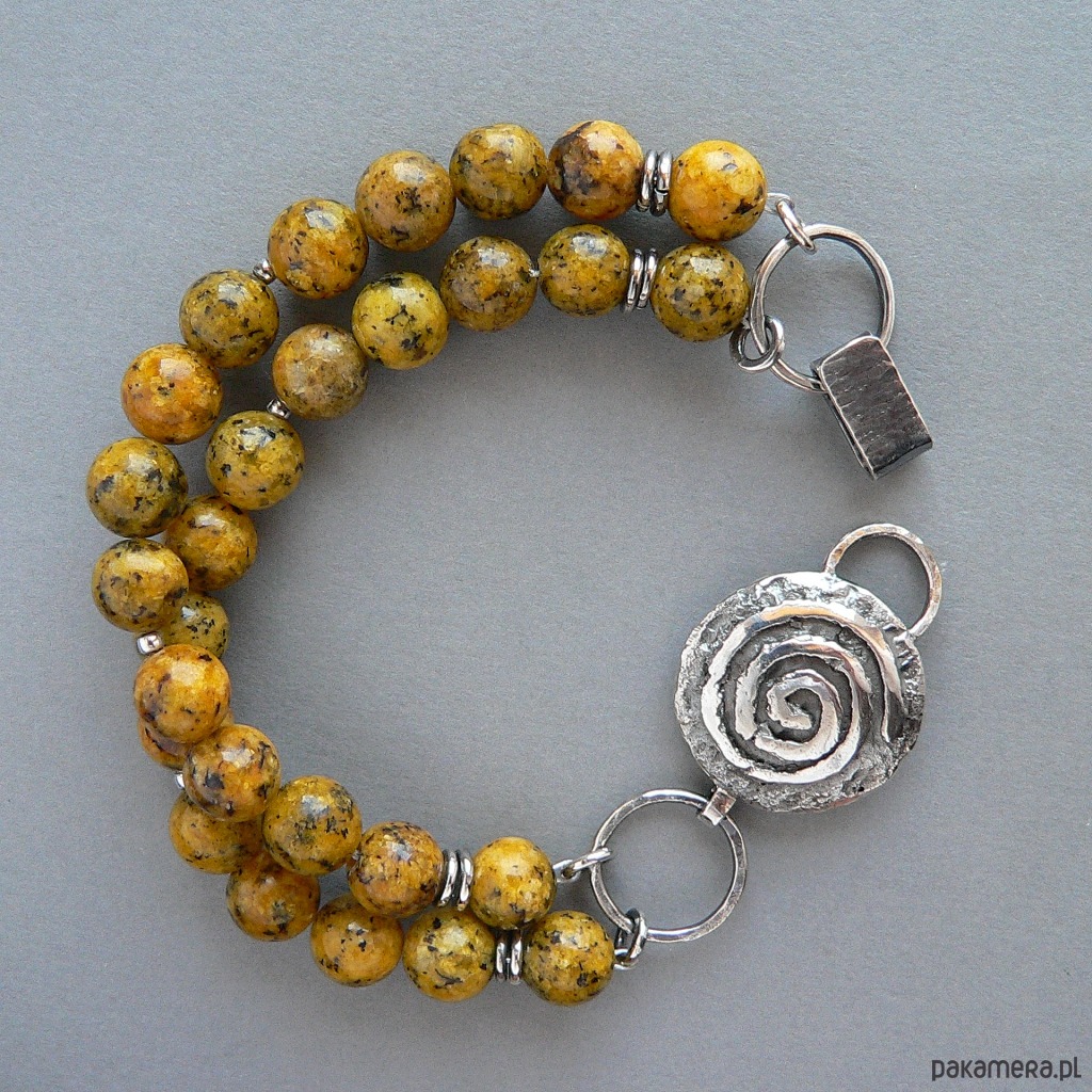 Bransoleta wykonana z kulek jaspisu w oliwkowo-żółtym odcieniu oraz srebra. Kamienie mocowane do srebrnego elementu formowanego ogniem o średnicy 2,2 cm Srebro kute, oksydowane i polerowane. Średnica kamieni 8 mm Bransoleta pasuje na nadgarstek o obwodzie 16,5 -17 cm Wygodne w samodzielnej obsłudze zapięcie. Kolor kamieni w rzeczywistości nieco mniej intensywny.