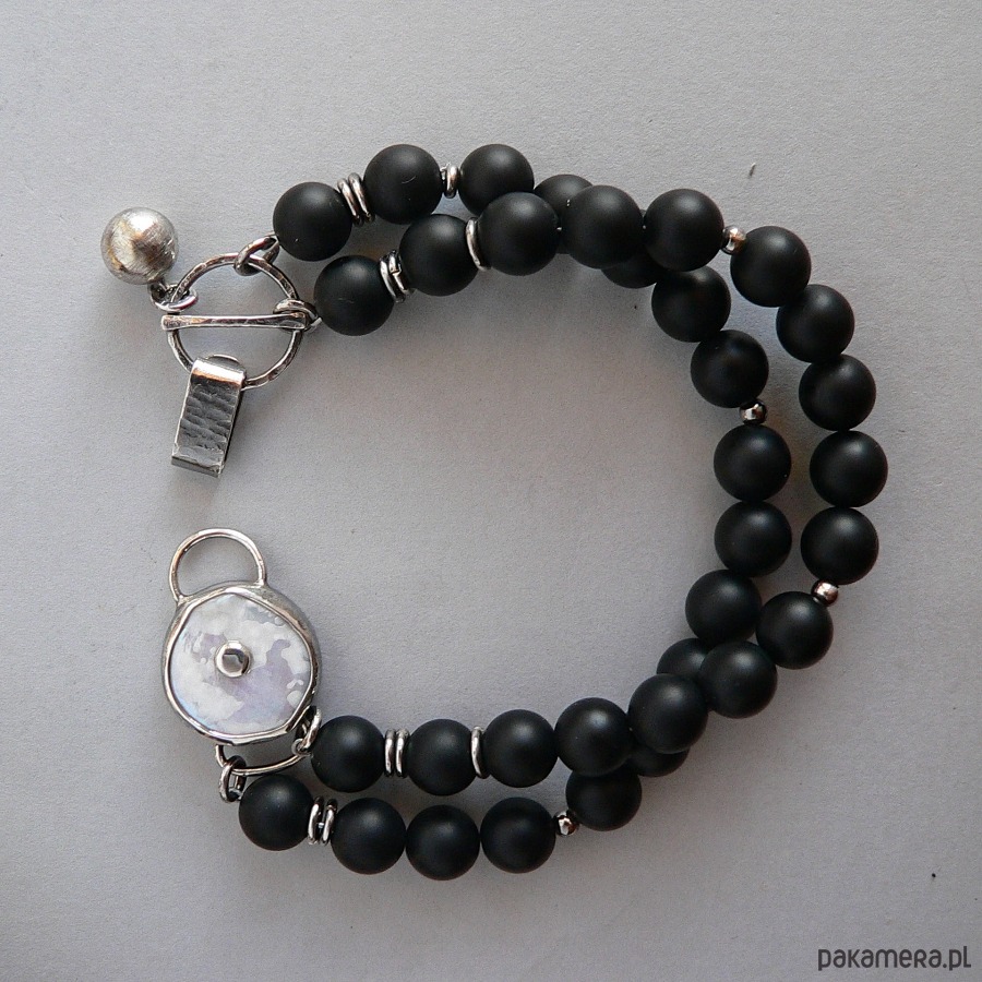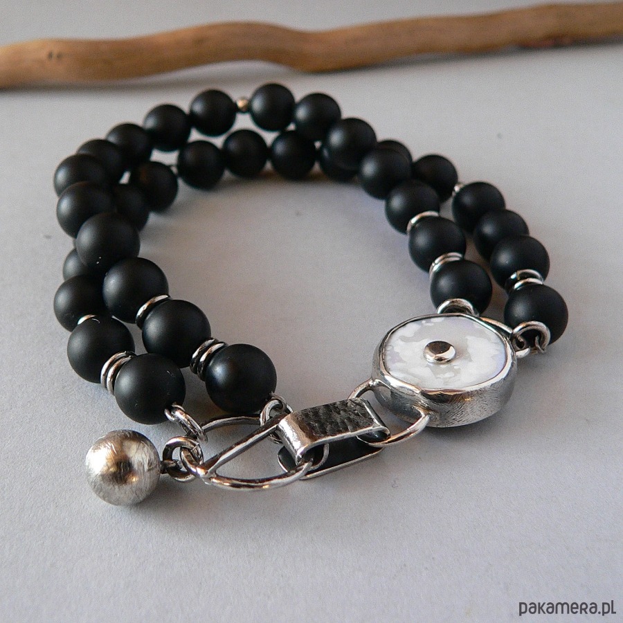 Bransoletka wykonana z perły hodowlanej, półmatowych onyksów i srebra. Srebro fakturowane, oksydowane, detale polerowane. Średnica onyksów- 8 mm, wymiary perły - 1,7/1,8 cm Całości dopełnia zawieszka -srebrna kulka o średnicy 8 mm. Bransoletka pasuje na nadgarstek o obwodzie 17 cm, możliwość przedłużenia lub skrócenia, proszę o wiadomość przy zakupie.