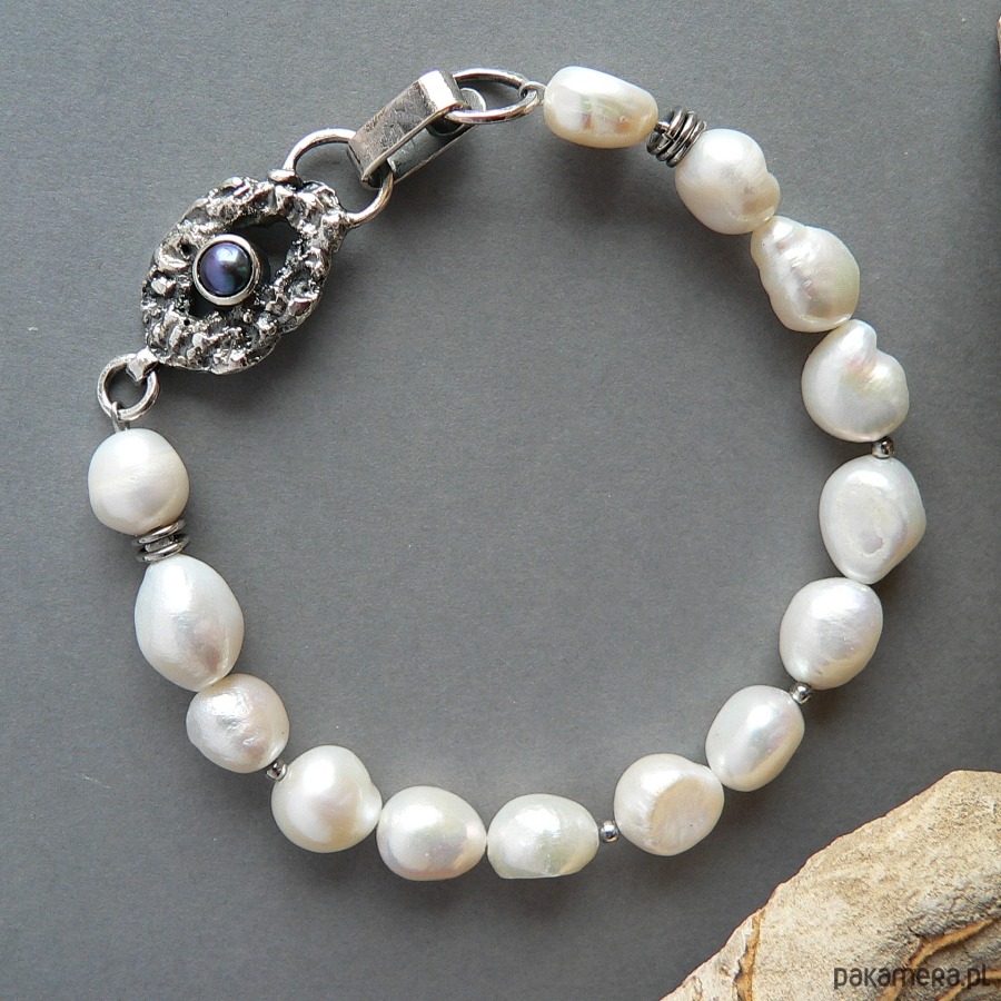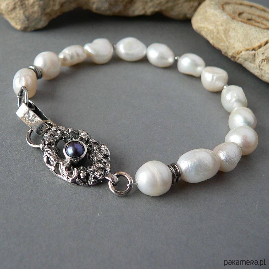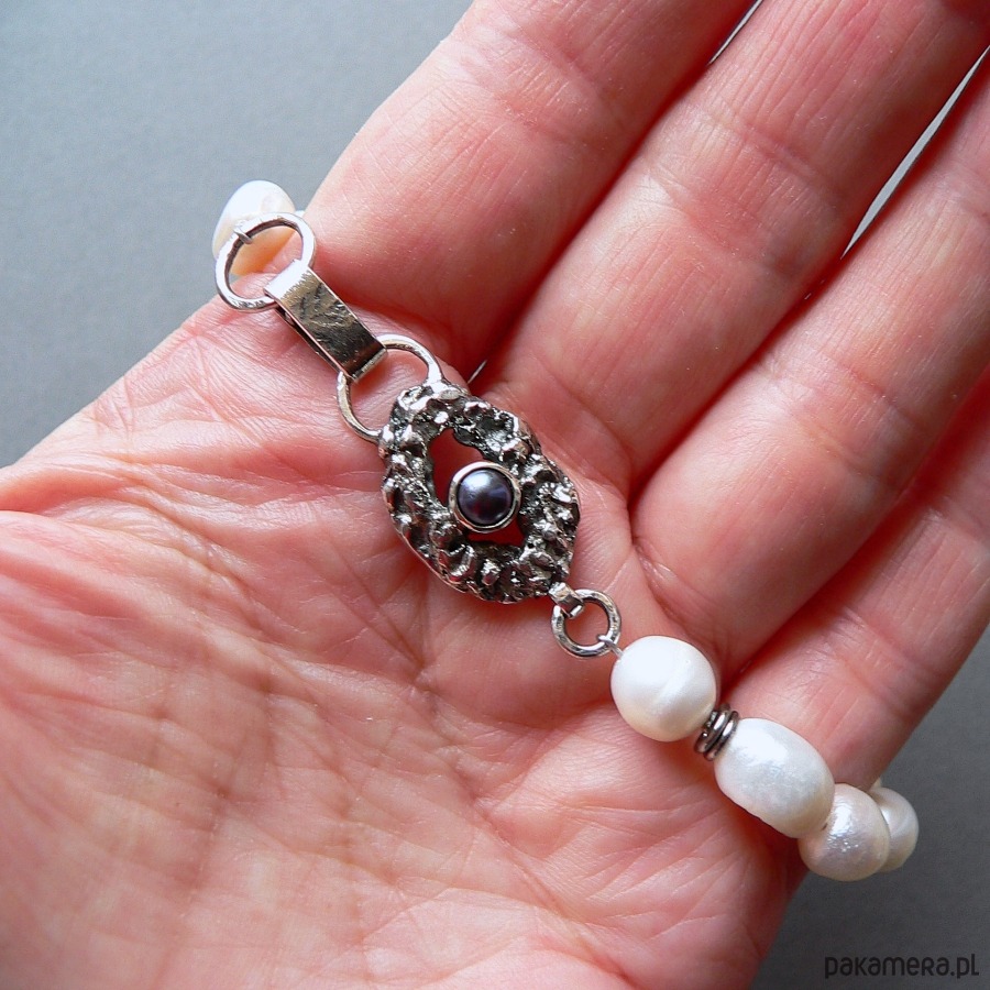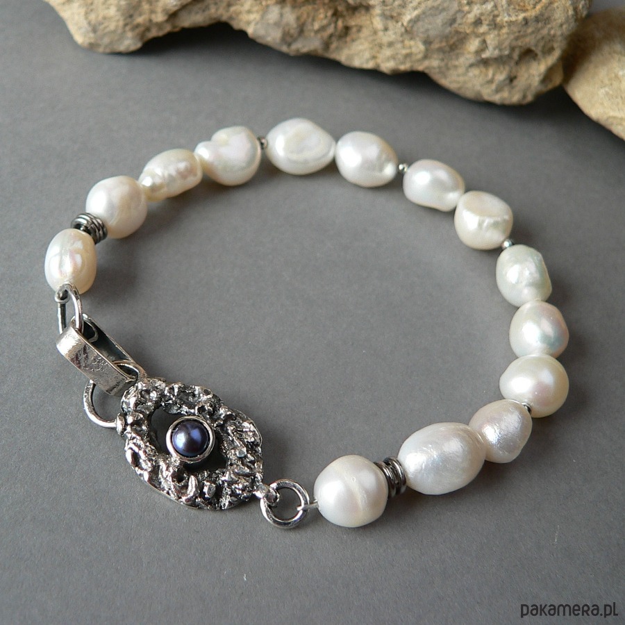 Bransoletka wykonana z nieregularnych pereł słodkowodnych w białym odcieniu, malutkiej grafitowej perełki i srebra. Wymiary pereł 8-10 mm Srebrny element ma surową fakturę, oksydowany i polerowany. Średnica perełki 4 mm Bransoleta pasuje na nadgarstek o obwodzie 17,5 cm Wygodne w samodzielnej obsłudze zapięcie. Wymiary srebrnego elementu formowanego ogniem 2/1,3 cm
