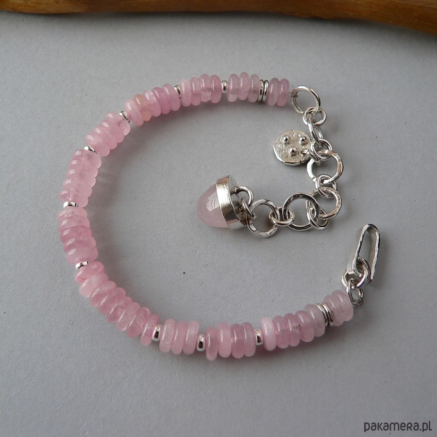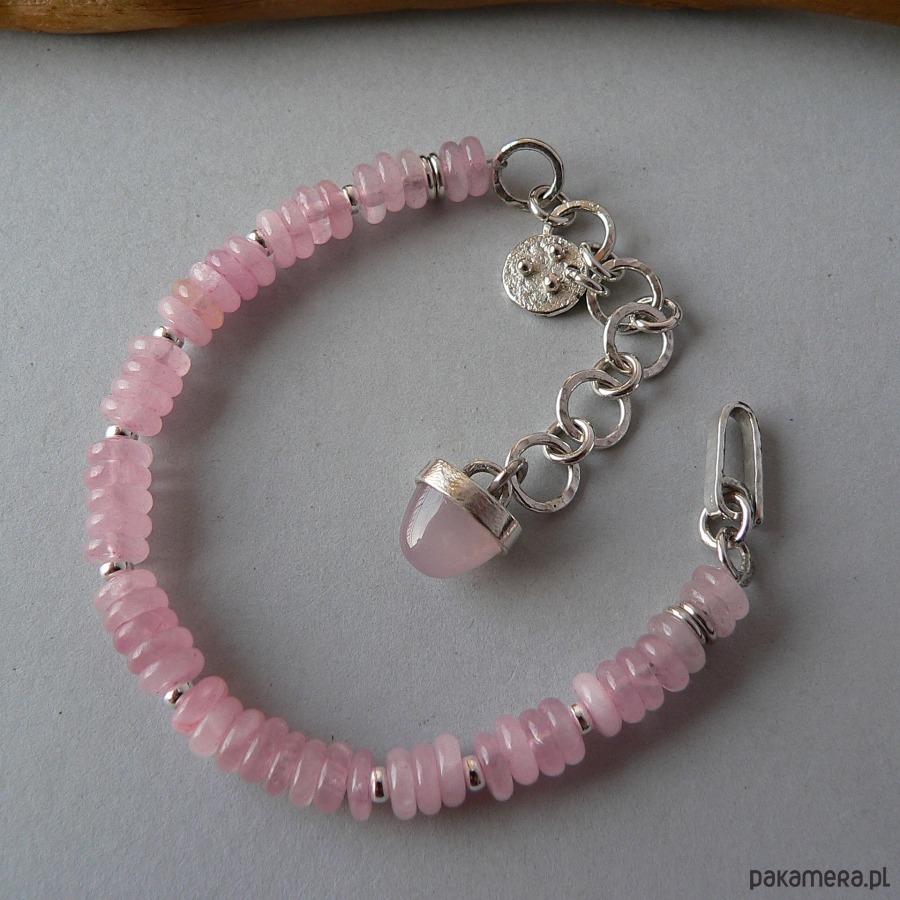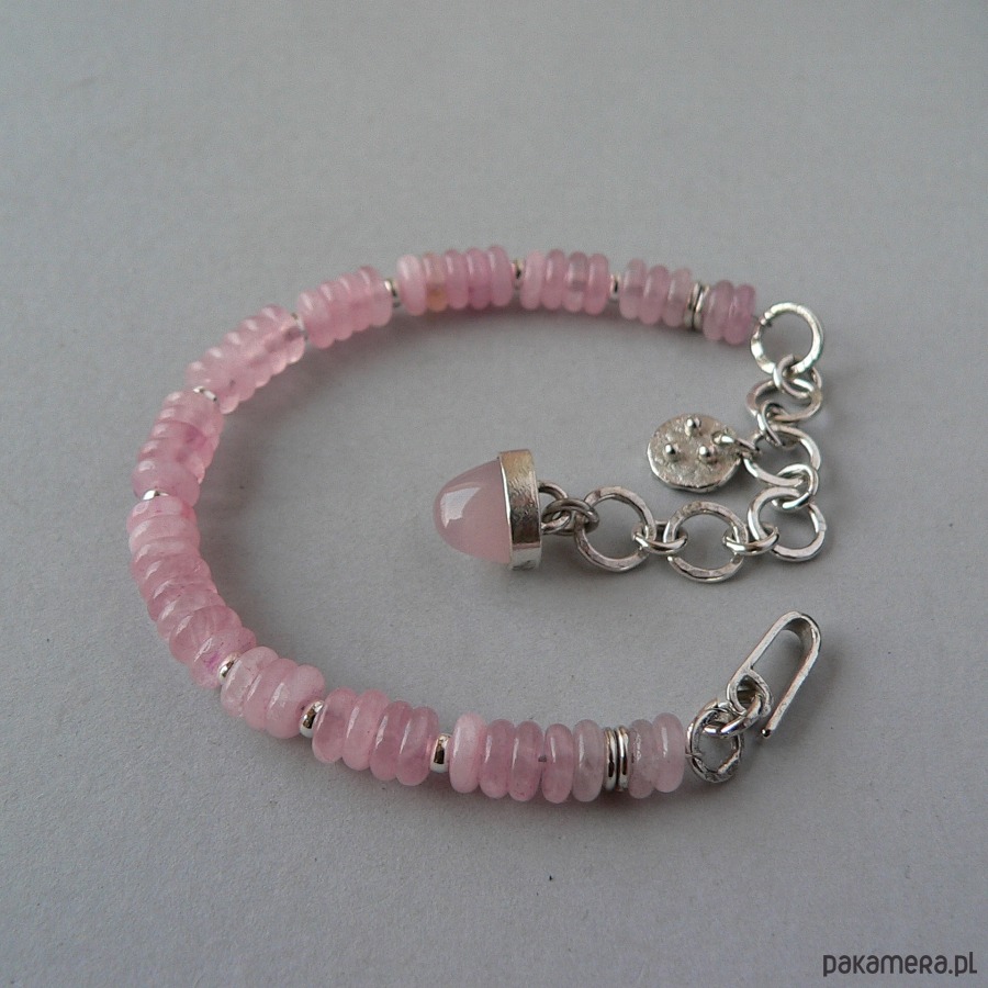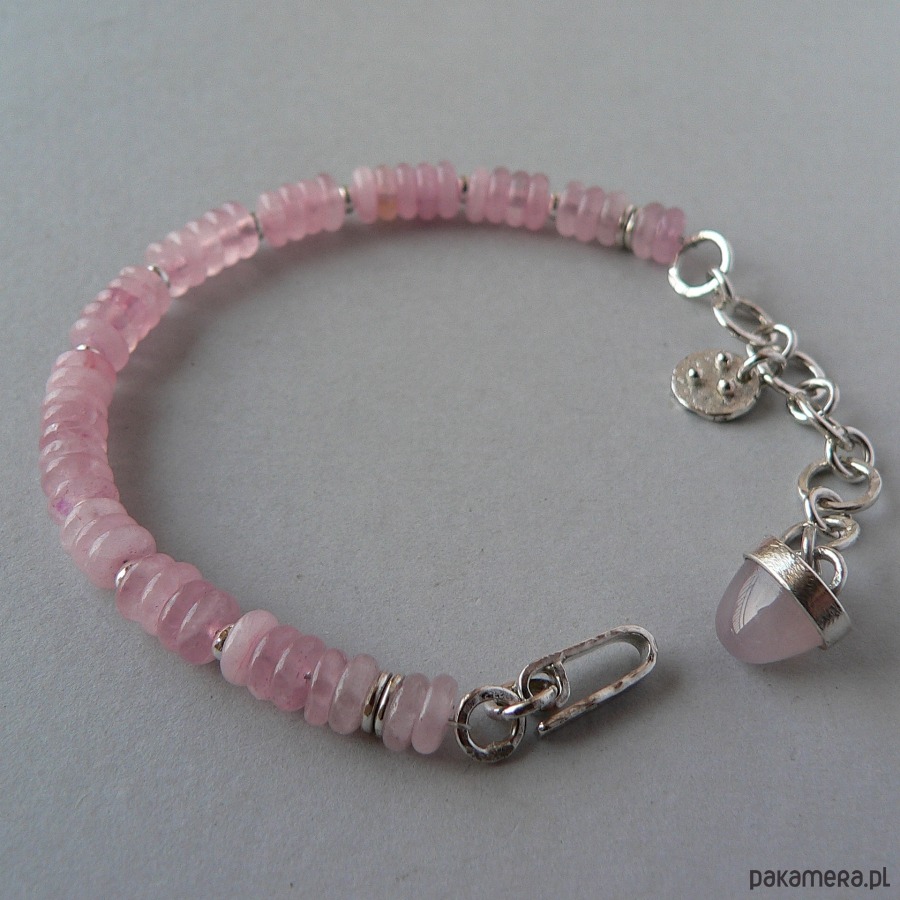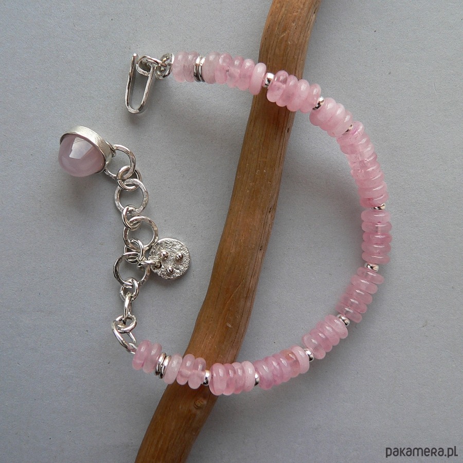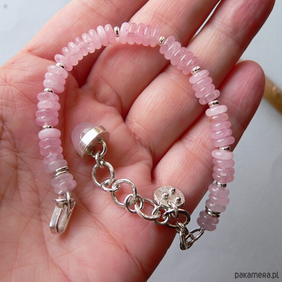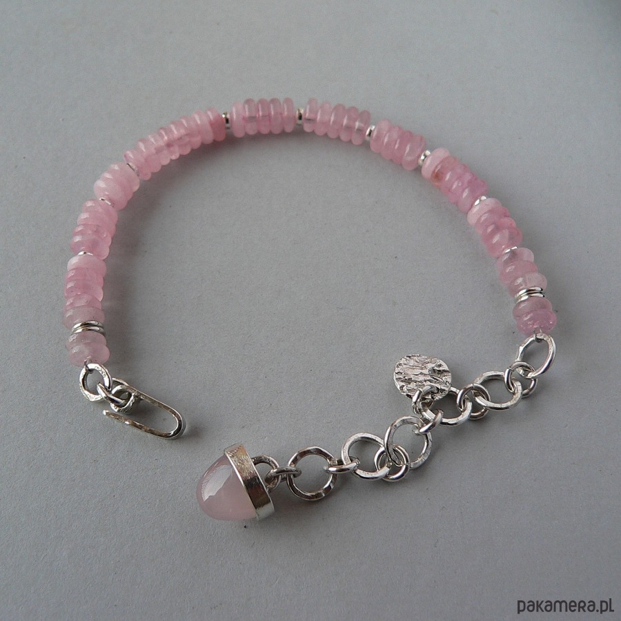 Delikatna bransoletka wykonana ze srebra oraz różowego kwarcu. Srebrne ogniwka kute i polerowane, zakończone zawieszką z kwarcem różowym wysokiej jakości o ciekawym, rzadkim szlifie.. Średnica srebrnych kółek 8 mm, średnica kamieni- 5- 6 mm Bransoletka pasuje na nadgarstek o obwodzie 16-17 cm