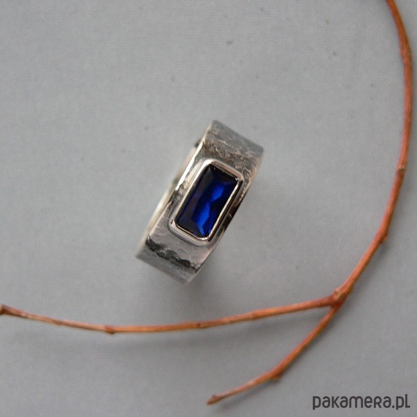 Obrączka wykonana ze srebra i syntetycznego szafiru. Srebro kute, oksydowane , przecierane, detale polerowane. Szerokość obrączki 7 mm wymiary kamienia 9/5 mm Rozmiar obrączki 19, dostępny również rozmiar 16