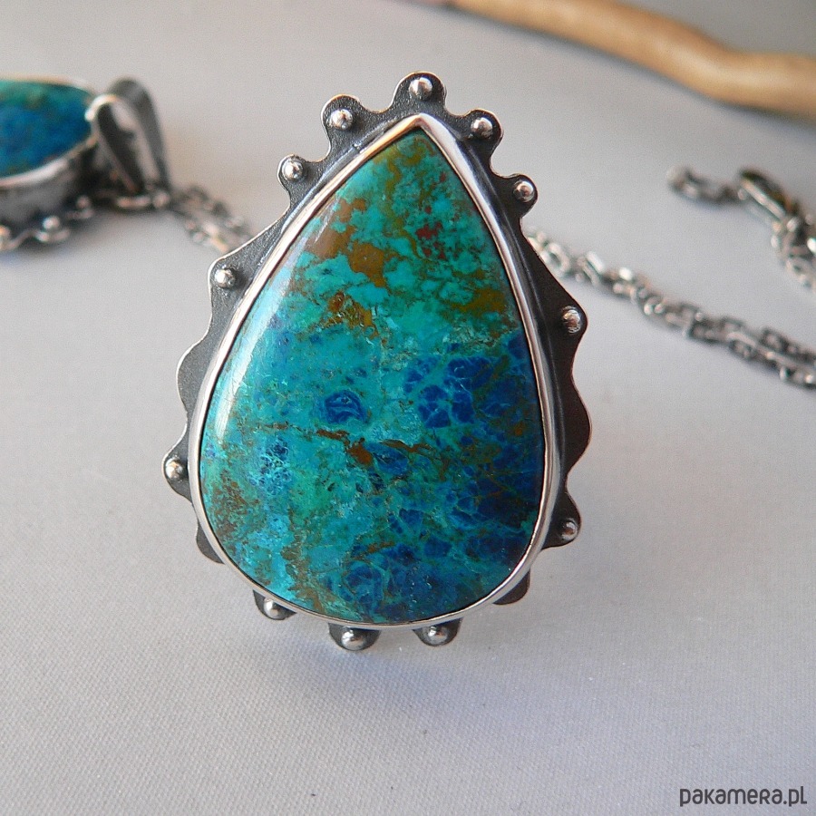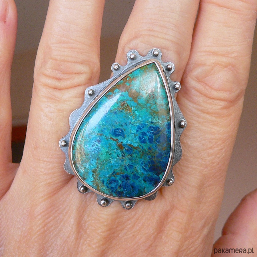 Masywny pierścień wykonany ze srebra oraz szatukitu o interesującym rysunku i pięknej barwie. Oksydowane srebro podkreśla intensywne kolory kamienia. Obrączka regulowana, przy zakupie proszę o podanie noszonego rozmiaru. Wymiary kamienia - 3,7/2,7 cm