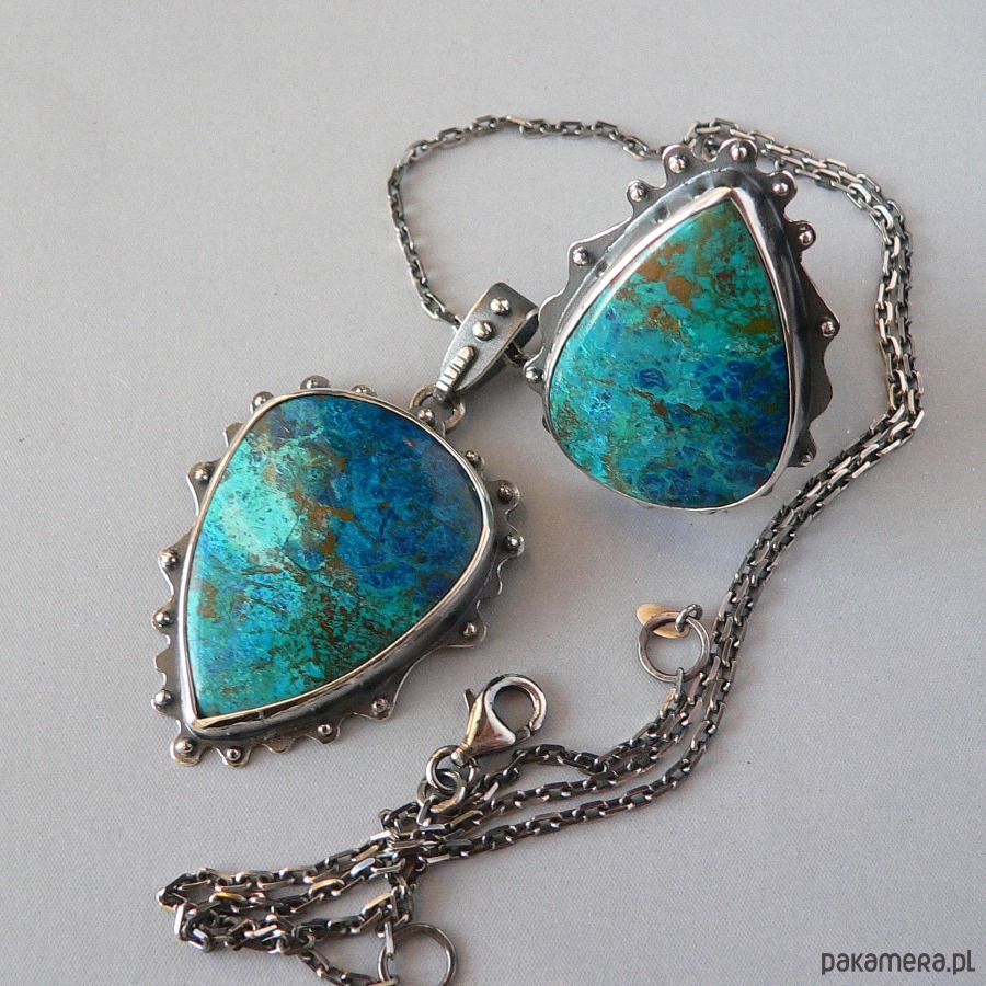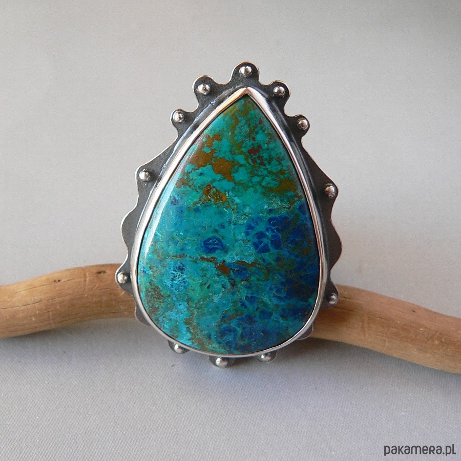 Masywny pierścień wykonany ze srebra oraz szatukitu o interesującym rysunku i pięknej barwie. Oksydowane srebro podkreśla intensywne kolory kamienia. Obrączka regulowana, przy zakupie proszę o podanie noszonego rozmiaru. Wymiary kamienia - 3,7/2,7 cm Do kompletu można dokupić wisior z nieco większym szatukitem.