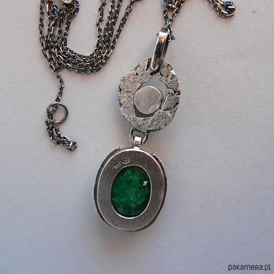 Wisiorek, którego sercem jest beryl w szmaragdowym odcieniu w formie nieregularnego , fasetowanego owalu. Towarzystwa dotrzymuje mu fasetowany granat w kolorze wina. Kamienie oprawione w oksydowane srebro, które pięknie podkreśla barwę kamieni. Całość ma surową , stylizowaną na dawną , formę. Wymiary kamieni- granat 6 mm średnicy, beryl 2/1,5 cm Długość całego elementu/wisiorka 5,4 cm Obwód łańcuszka- 56 cm, możliwość zakupu bez łańcuszka, proszę o wiadomość przed! zakupem.