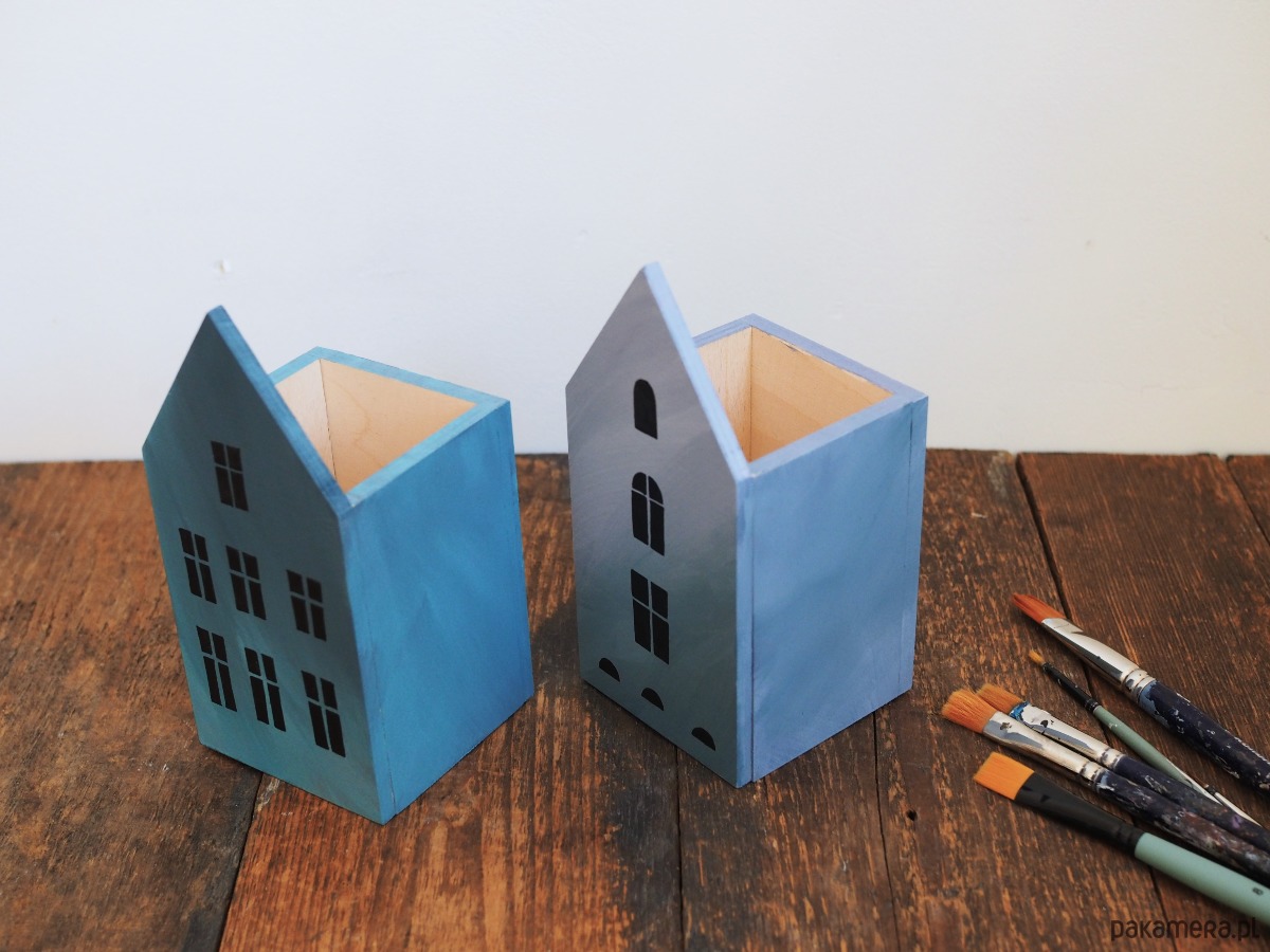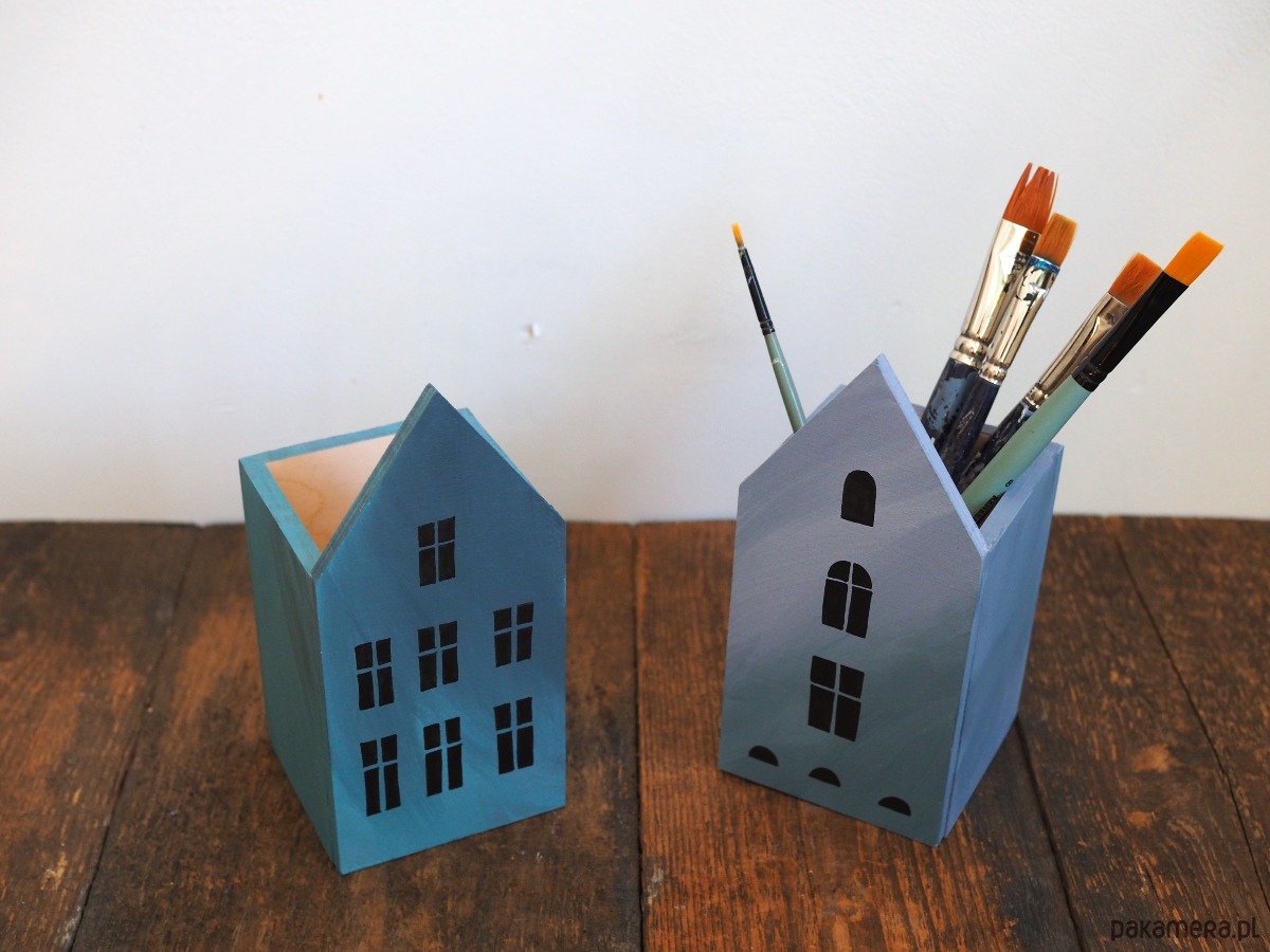 Pojemnik na kredki lub inne przybory artystyczne, wykonany z drewna, pomalowany farbami akrylowymi.