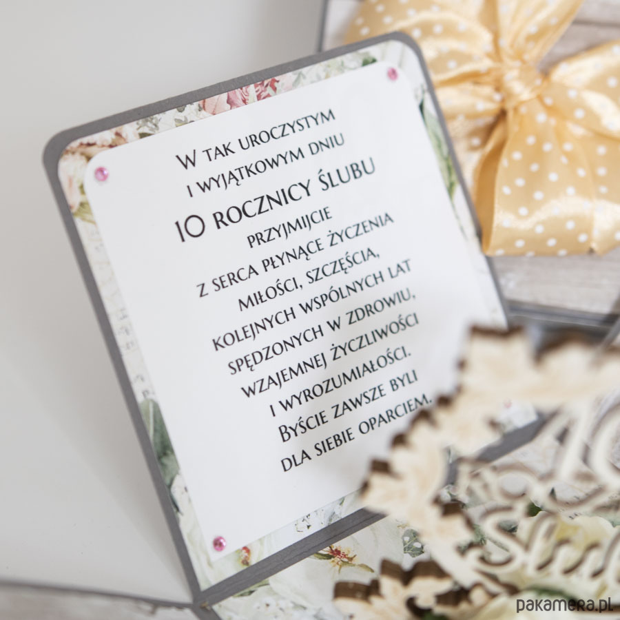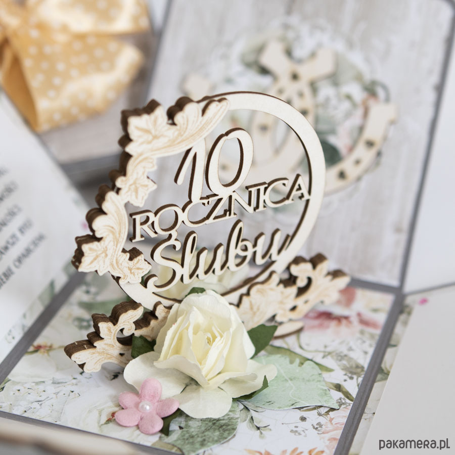 Ręcznie robiona kartka z okazji 10 rocznicy ślubu w formie rozkładanego pudełeczka.