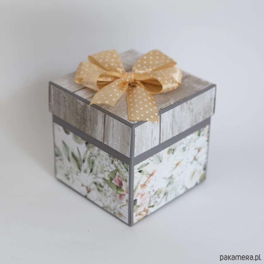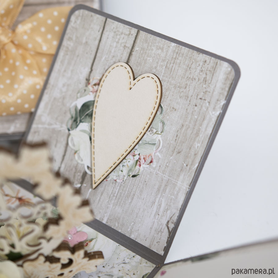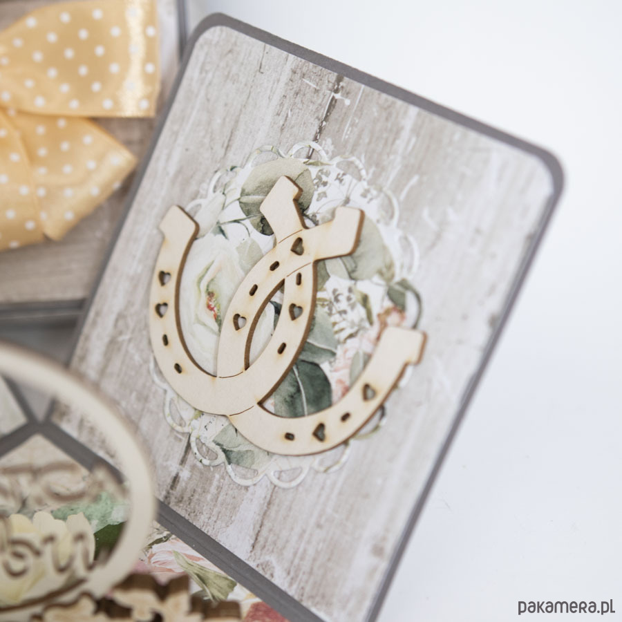 Na środku pudełeczka znajduje się dekoracja z papierowymi kwiatuszkami, na ściankach motyw serca, życzenia dla solenizantów, miejsce na podpis oraz splecione ze sobą podkowy.
