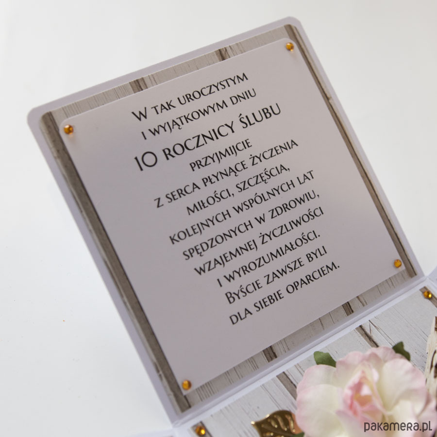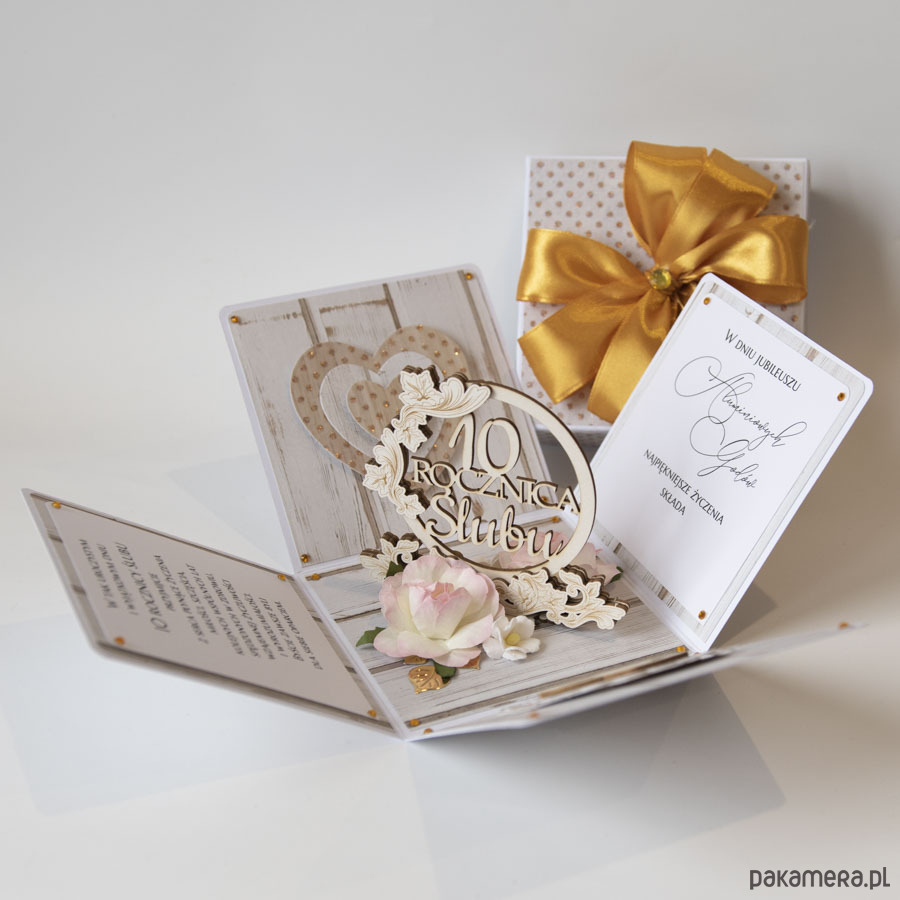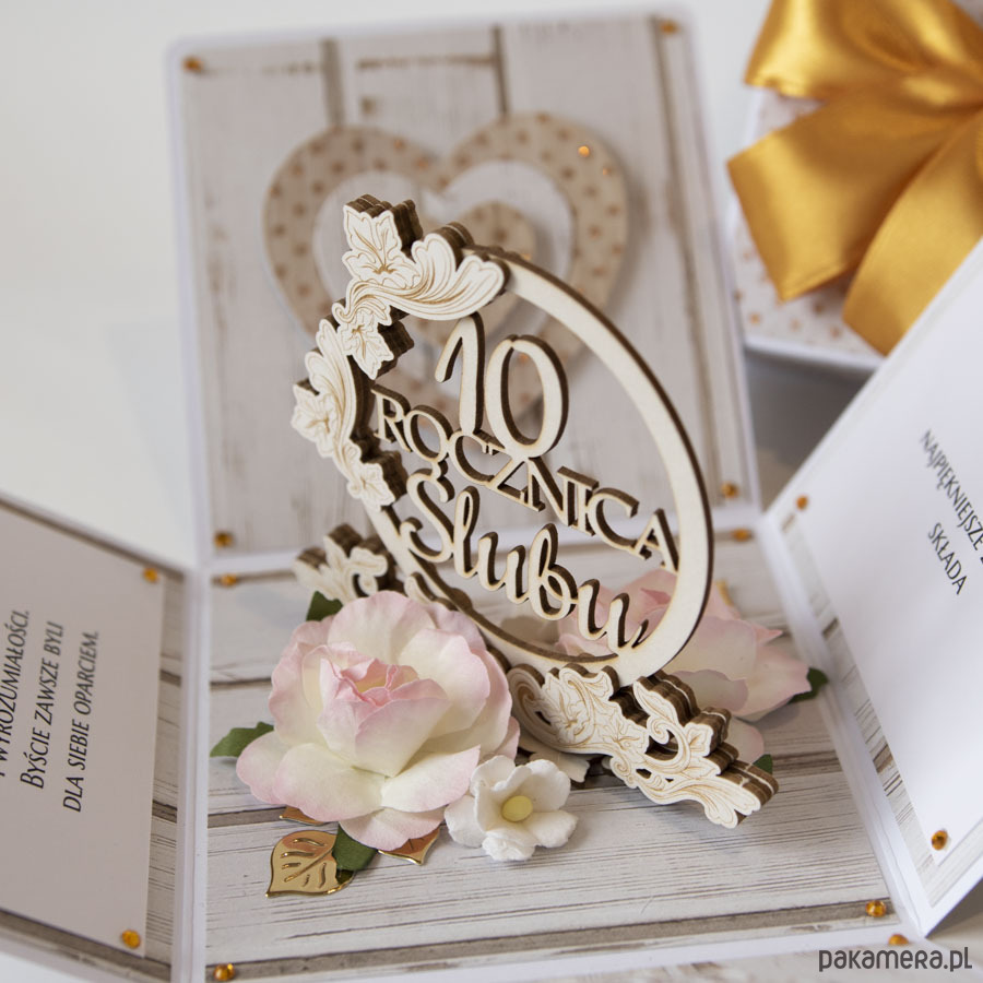 Ręcznie robiona kartka z okazji 10 rocznicy ślubu w formie rozkładanego pudełeczka.