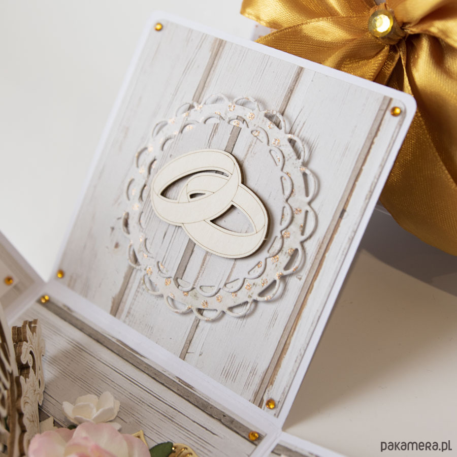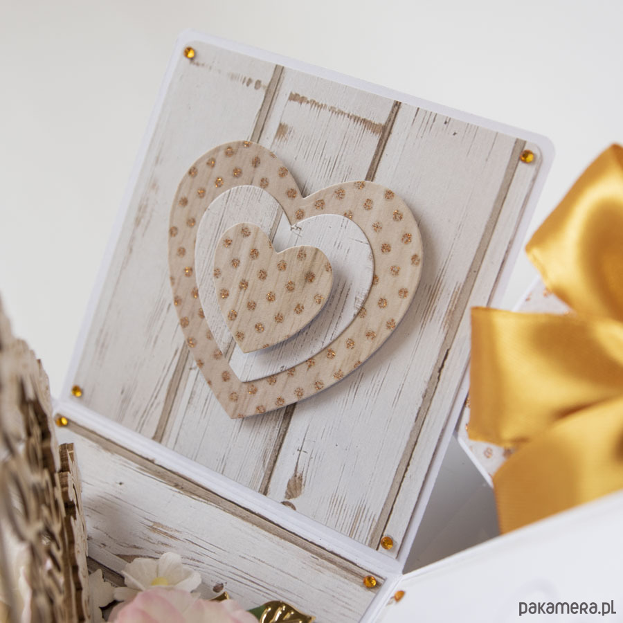 Na środku pudełeczka znajduje się dekoracja z papierowymi kwiatuszkami, na ściankach motyw serca, życzenia dla solenizantów, miejsce na podpis oraz splecione ze sobą obrączki.