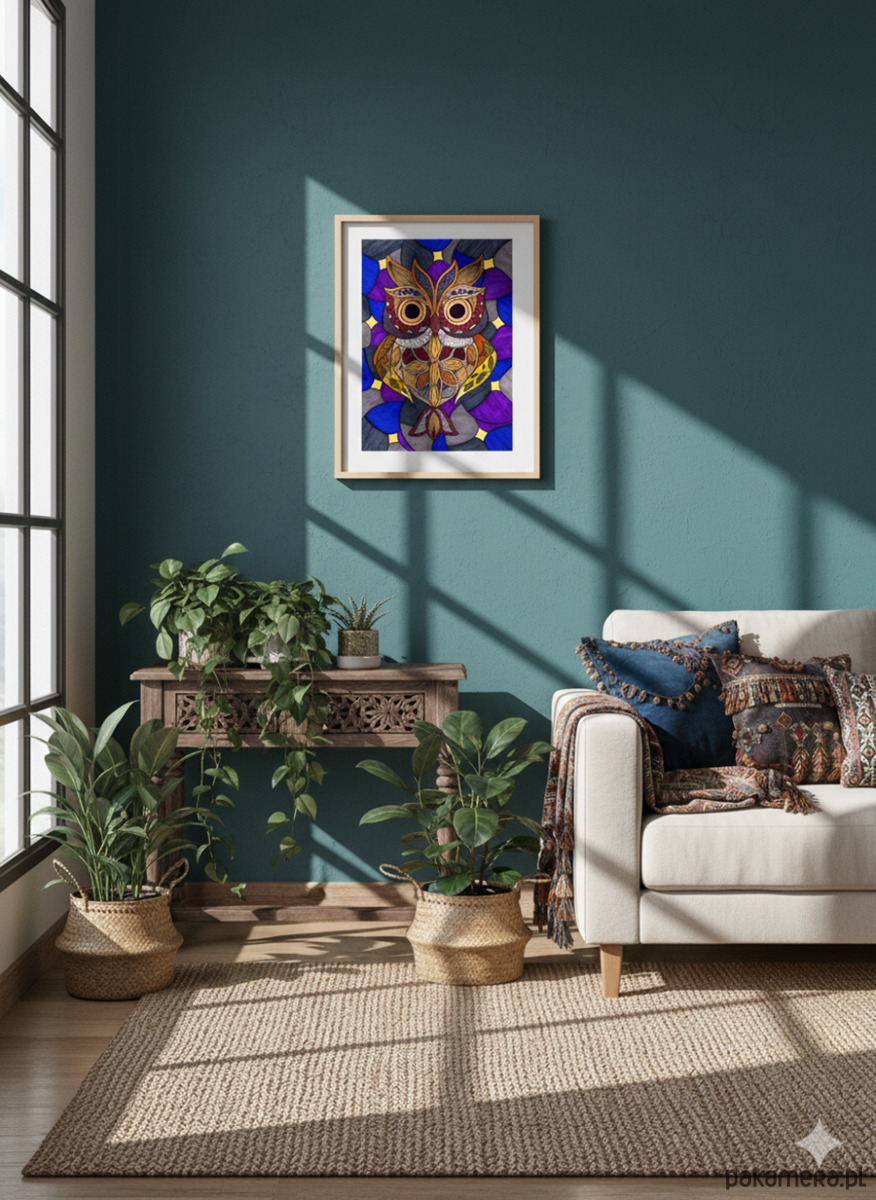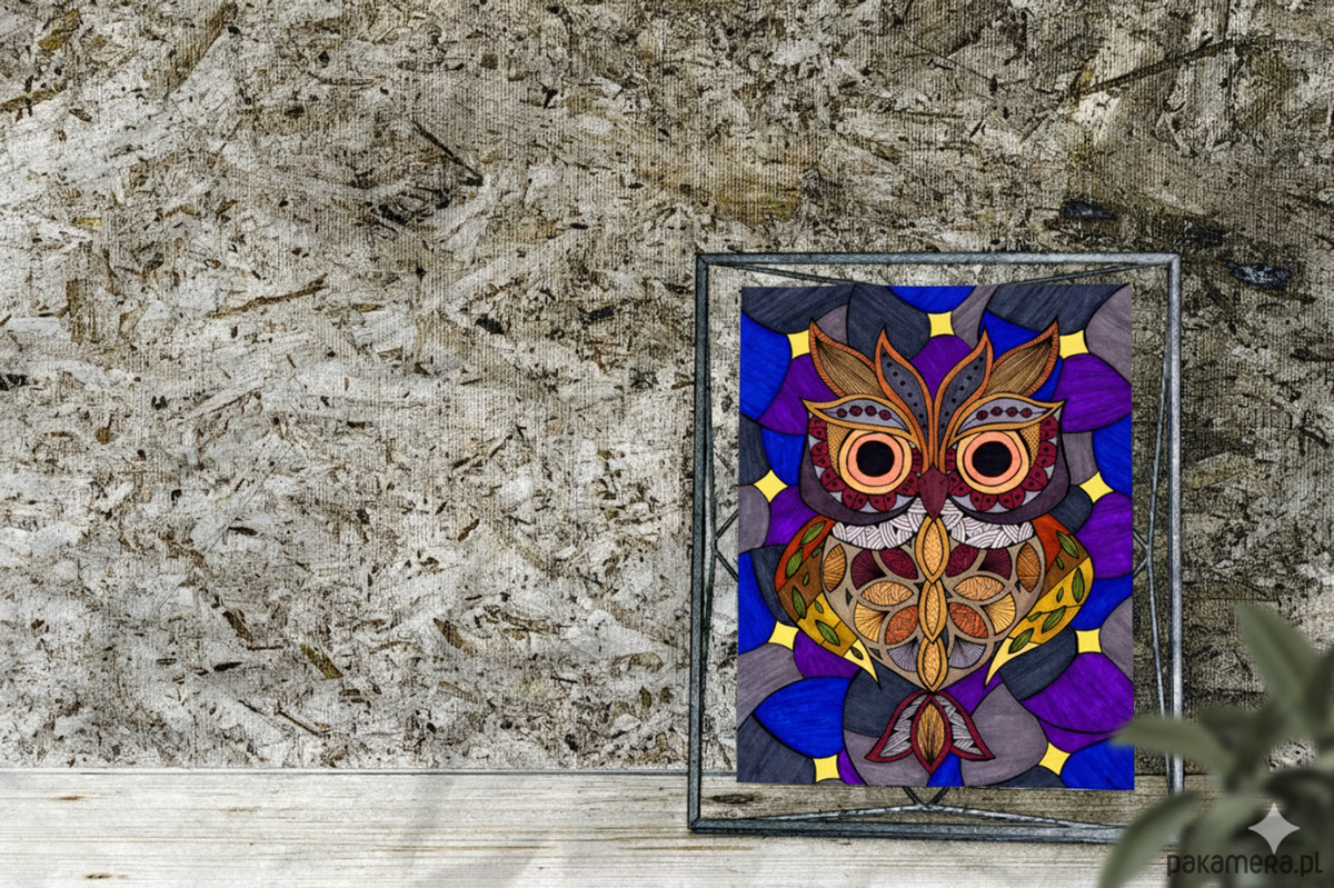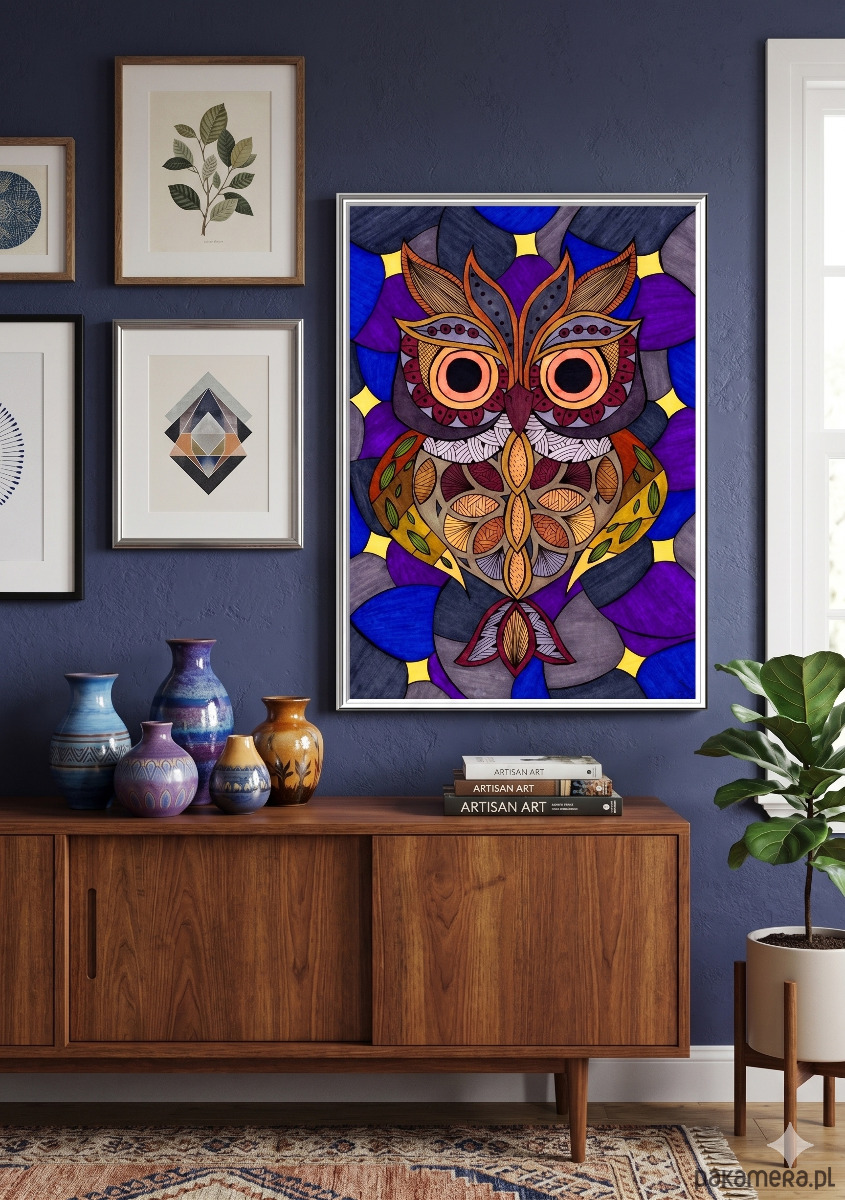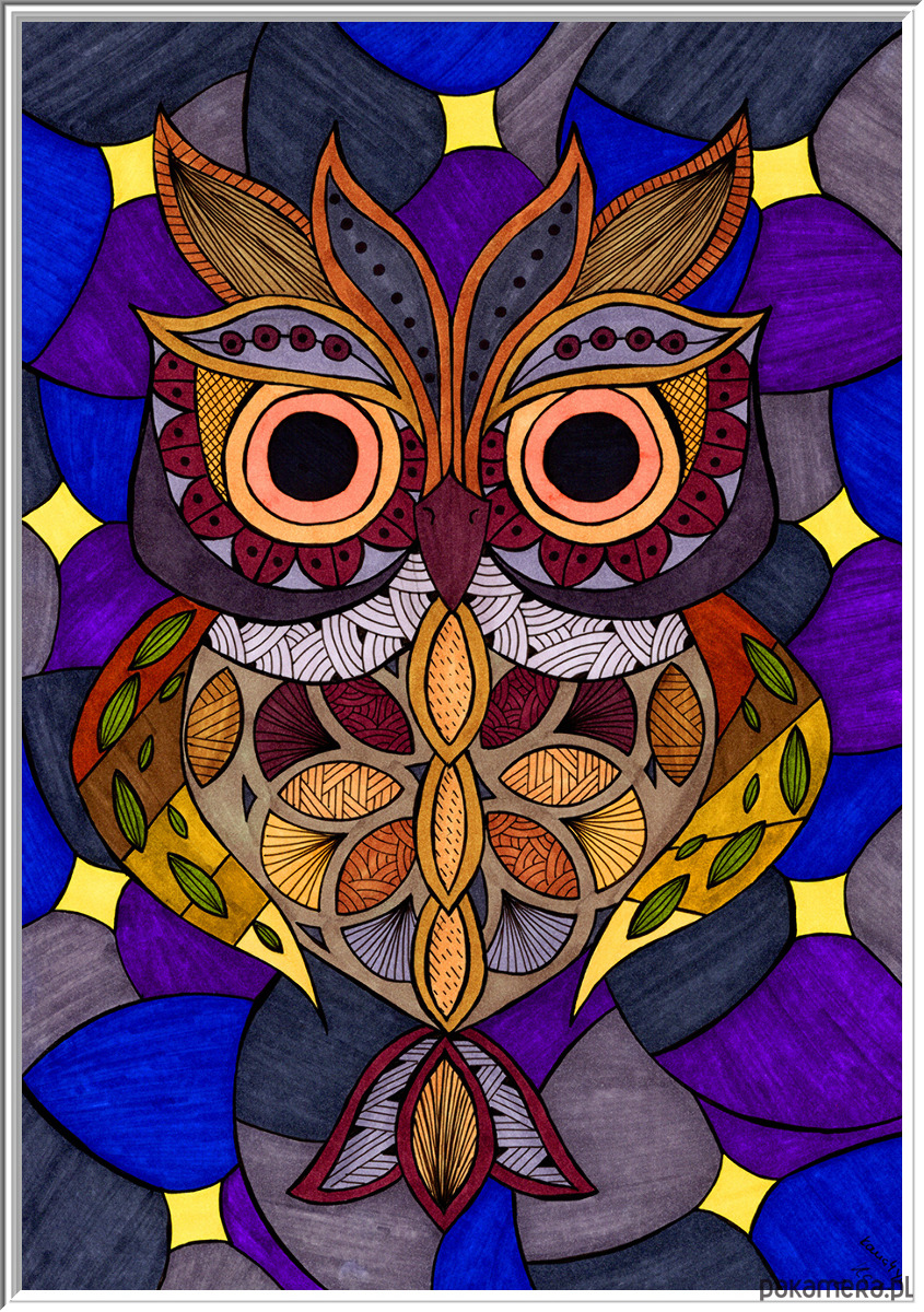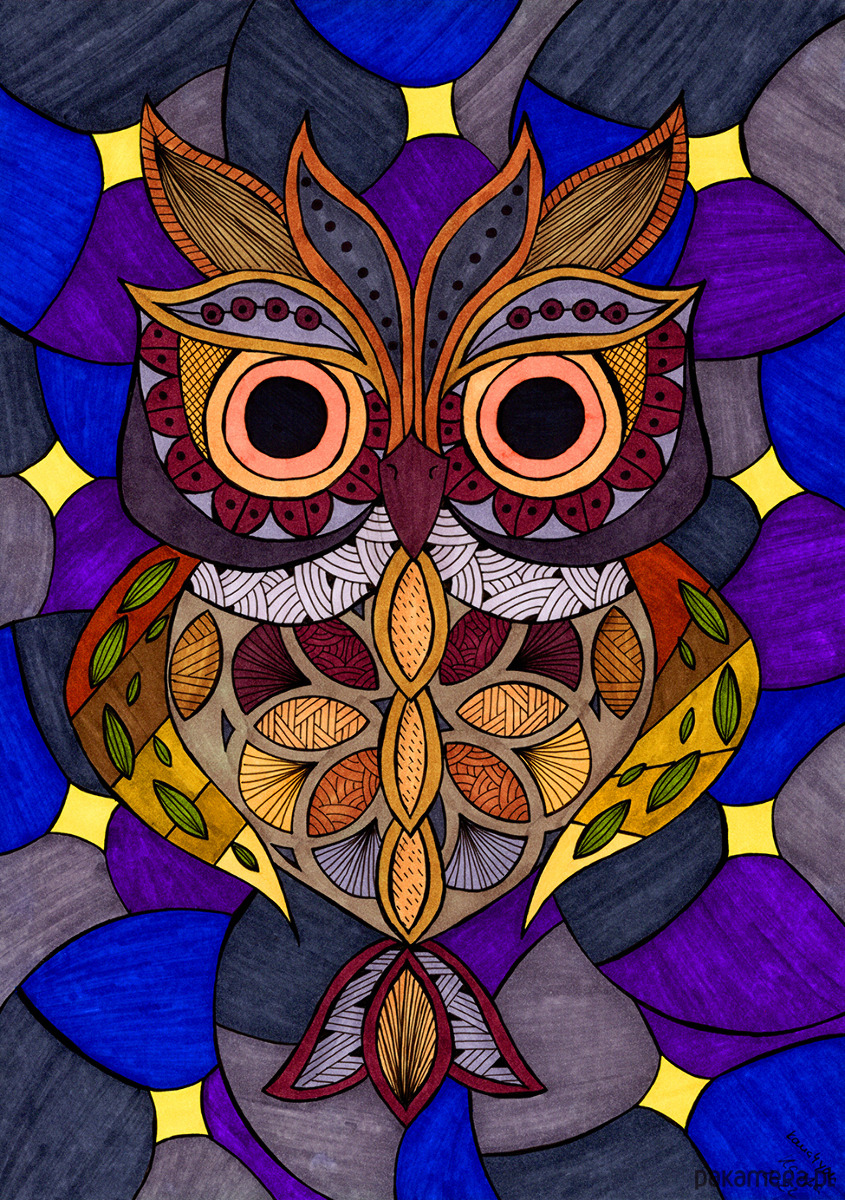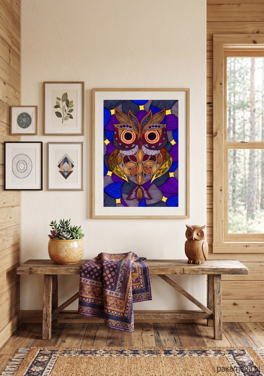 Postać sowy jest w całości zbudowana z sekcji wypełnionych drobnymi, etnicznymi i geometrycznymi wzorami (Zentangle Inspired) w palecie jesiennych brązów, terakoty, musztardowej żółci i burgundu.