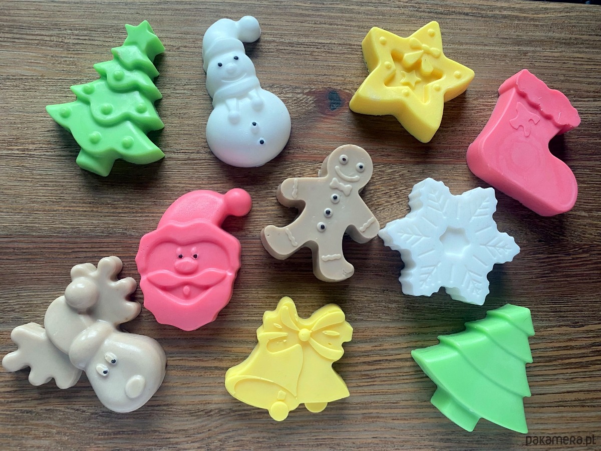 Chcesz komuś podziękować? Dać bliskim co wyjątkowego? Podaruj im coś ręcznie robionego i pachnącego świętami. Zestaw 10 dekoracyjnych mydełek zapachowych w świątecznych kształtach,w 3 zapachach: imbiru, czekolady i lawendy,mięty. Wszystkie mydełka ważą 50g (+/-5g) wyjątkiem jest wieniec który waży 25g. W każdym zestawie 10 sztuk żaden wzór się nie powtarza. Mydełka zawierają masło shea i olejek imbirowy, renifery, ludzik i małe ludziki zawierają masło kakaowe i obłędnie pachną czekoladą z nutką olejku lawendowego, choinki wspaniale pachną olejkiem z mięty pieprzowej.Zawieszkę z opisem produktu możemy zamienić gratis na napis "Wesołych Świąt" lub inny dowolny napis.Przykładowe wymiary mydełek: ludzik 8 cm wyskości i 2,5cm grubość, gwiazda średnica 7,5cm, bałwanek 9 cm wysokości, wieniec średnica 6 cm, mikołaj z oczkami 8 cm wysokości, renifer 7,5cm wysokości.