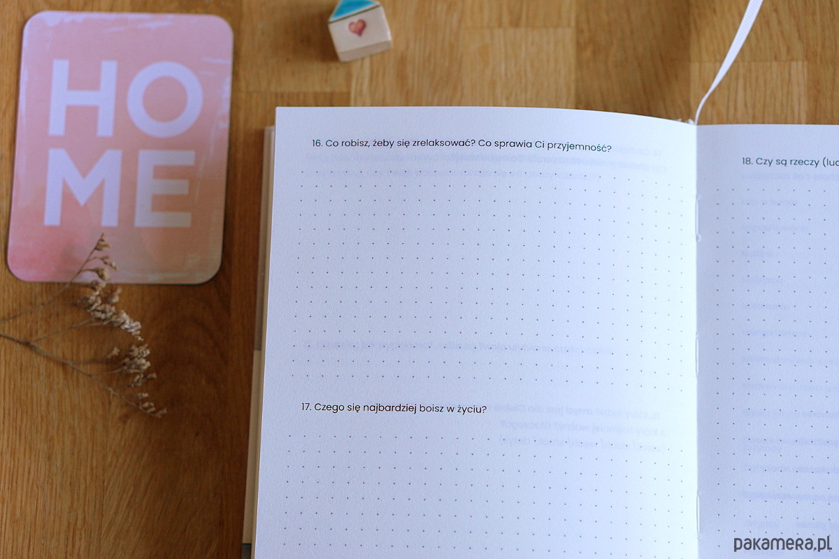 W środku znajduje się 100 pytań z rozmaitych obszarów życia - relacje, praca, wartości, potrzeby, marzenia, plany... mają one na celu głębsze poznanie siebie, które jest niezbędne do szczęśliwego i satysfakcjonującego życia!