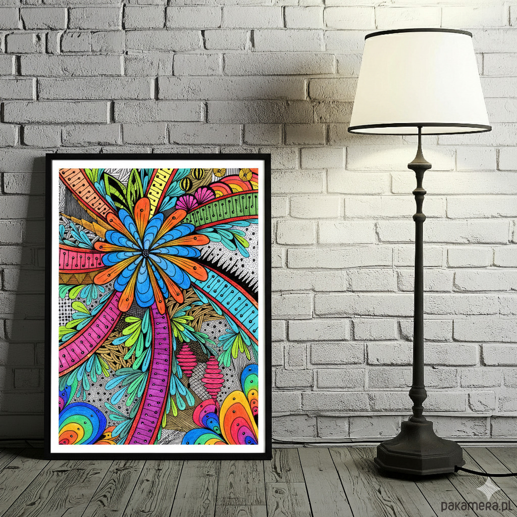 Chaotyczne, czarno-białe tło (jak skomplikowana codzienność) jest tu niemal wchłonięte przez ekspandujące, radosne pasma koloru. To wyraża triumf pozytywności – uczucie, że nawet w najbardziej skomplikowanym otoczeniu zawsze można odnaleźć drogę do barwnej, wewnętrznej radości.