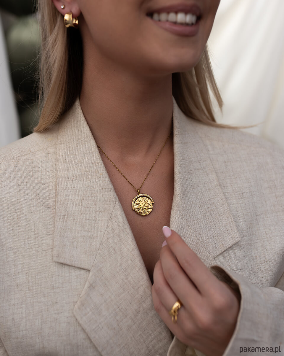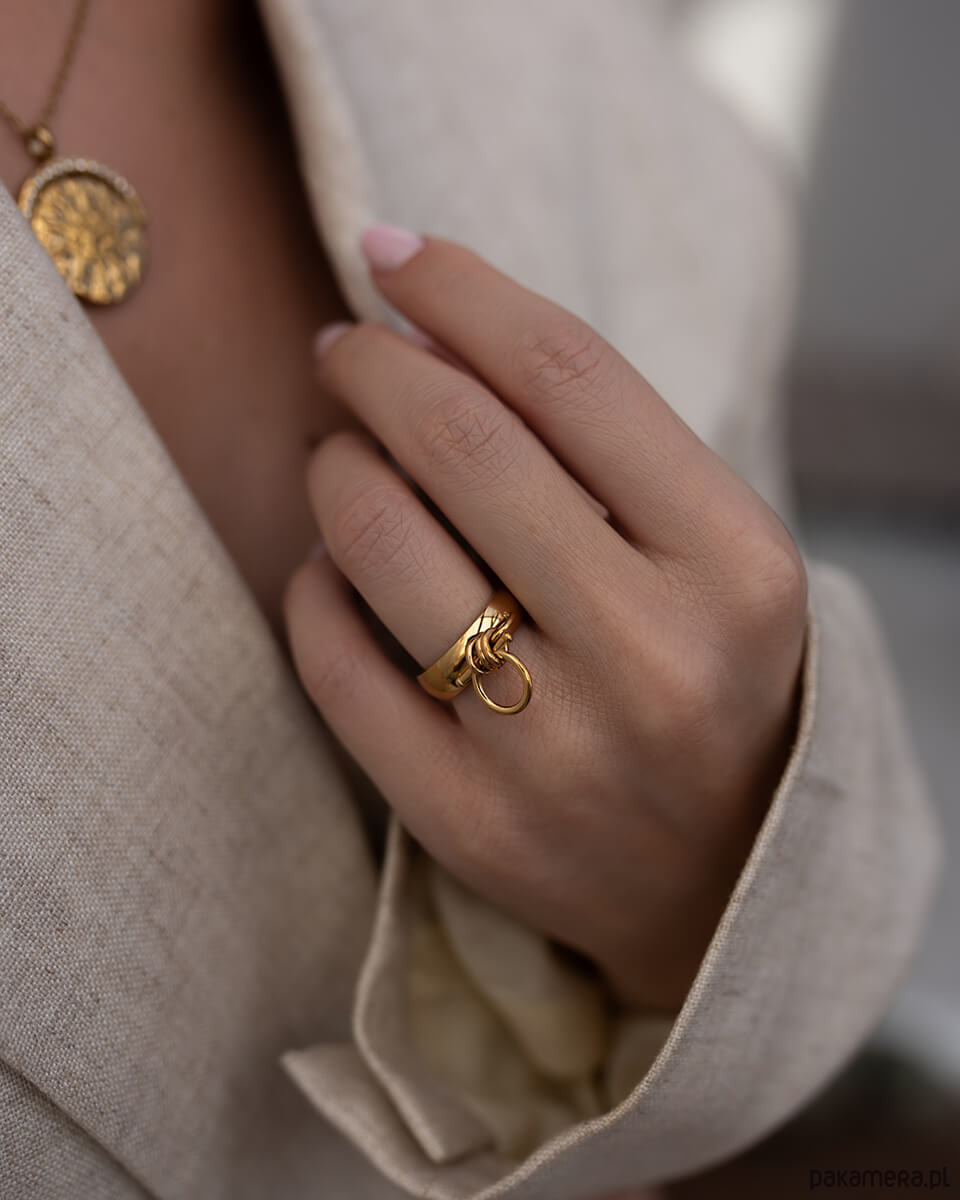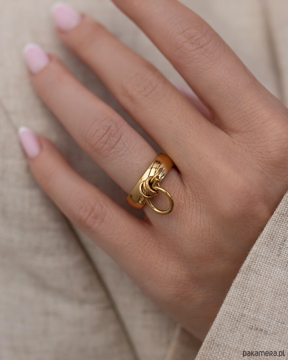Lubisz biżuterię, która ma charakter? Ten wyjątkowy złoty pierścionek ze stali chirurgicznej to propozycja dla kobiet, które nie boją się wyróżniać. Minimalistyczna obrączka została uzupełniona o oryginalny, rzeźbiarski detal w formie małego pierścienia z poprzecznym pręcikiem. To biżuteria, która intryguje formą i dodaje stylizacji pazura.Szczegóły:Wybierz jeden z dwóch dostępnych rozmiarów.Materiał: stal chirurgiczna premiumWodoodporny i hipoalergiczny - idealny dla osób z wrażliwą skórąSzukasz niebanalnego prezentu dla przyjaciółki, siostry albo… siebie? Ten pierścionek to manifest pewności siebie i niezależności - idealny wybór dla kobiety, która zna swoją wartość. 11 (średnica 16 mm)