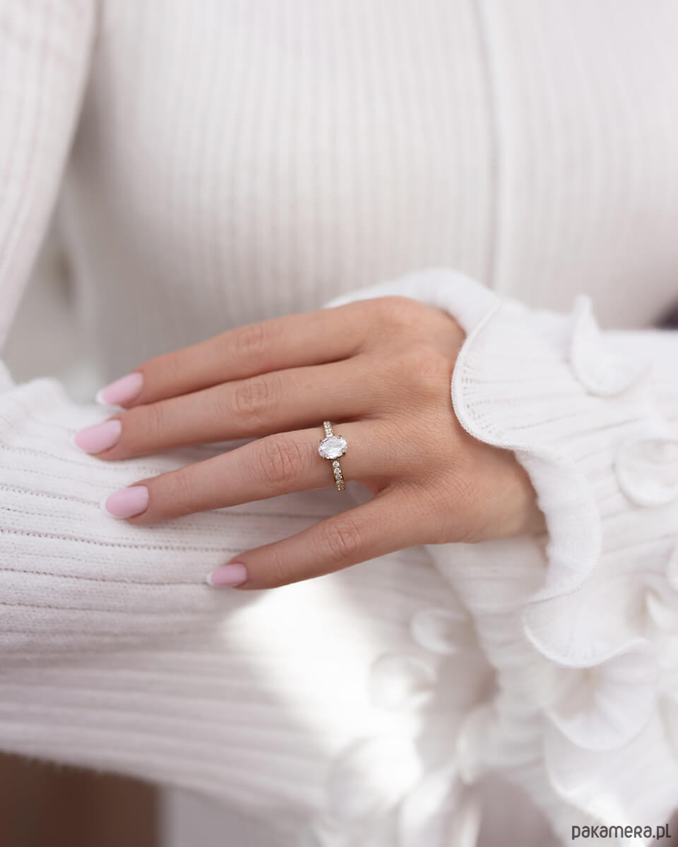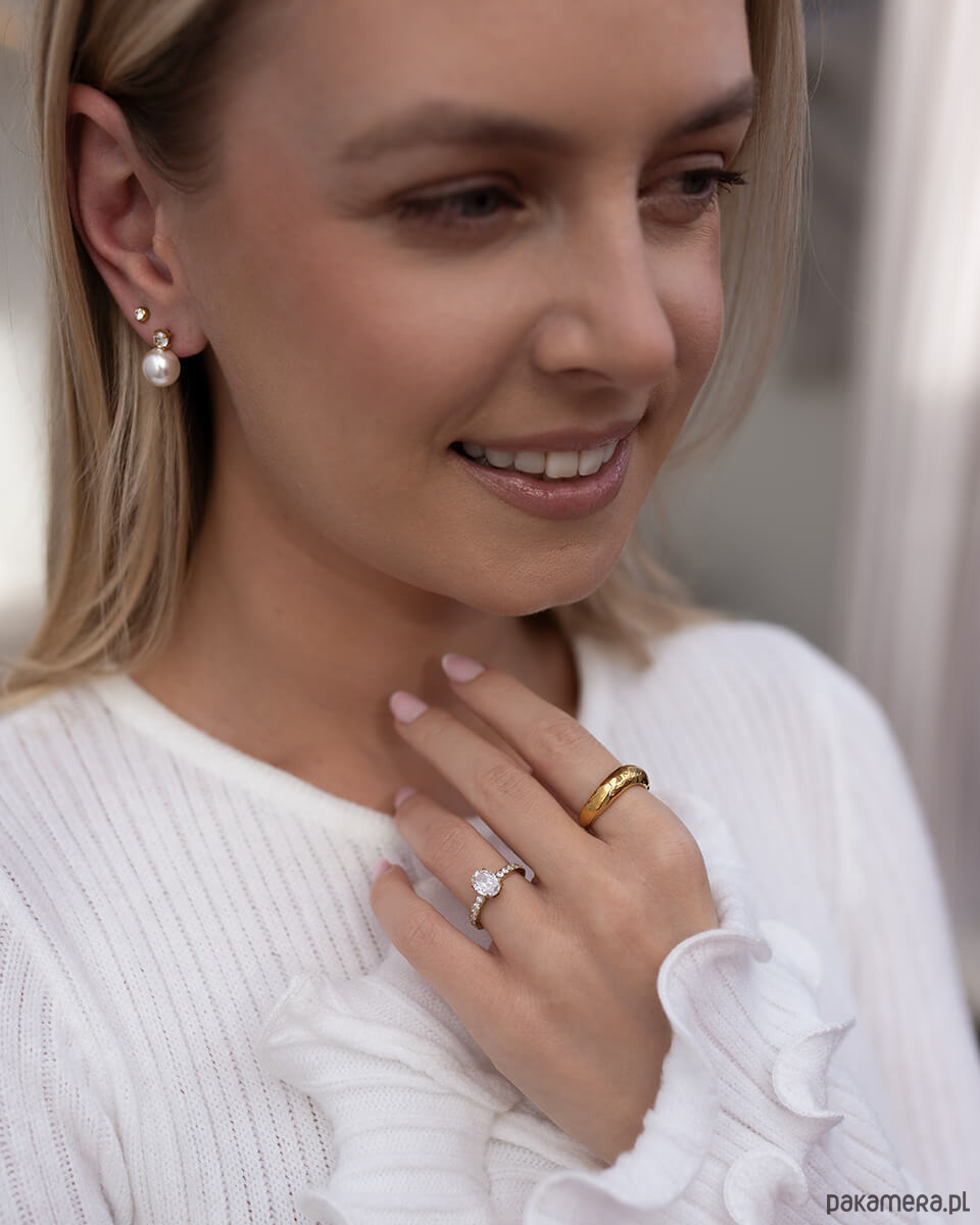 Ten złoty pierścionek z cyrkoniami łączy luksusowy blask z codzienną wygodą. To idealny wybór dla kobiet, które kochają subtelny szyk i nie boją się błyszczeć, niezależnie od okazji.Centralnie umieszczona efektowna cyrkonia w szlifie owalnym (1,7 cm x 0,8 cm) przyciąga światło niczym prawdziwy diament, a drobne kamienie po bokach dodają całości finezji i elegancji. Pierścionek dostępny jest w dwóch rozmiarach do wyboru: - 11 (średnica 16 mm, obwód 50 mm)- 14 (średnica 17 mm, obwód 53 mm)Wybierz idealny dla siebie rozmiar. 11 (średnica 16 mm)