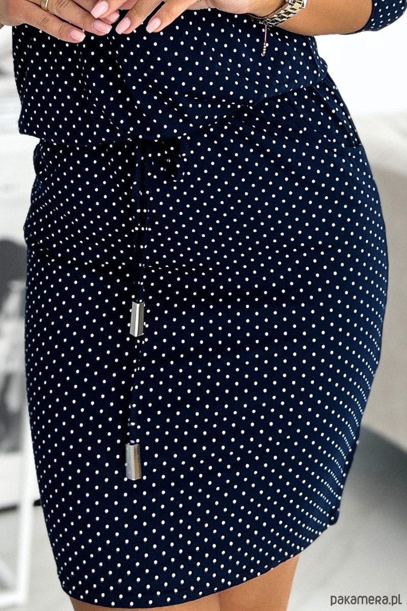 Sportowa sukienka z kieszonkami i rękawkiem 3/4. Uszyta z granatowej polskiej wiskozy w małe białe kropeczki. Marka numoco. Produkcja polska. Przy wyborze rozmiaru należy kierować się obwodem bioder.