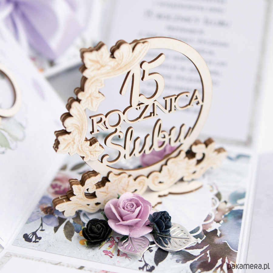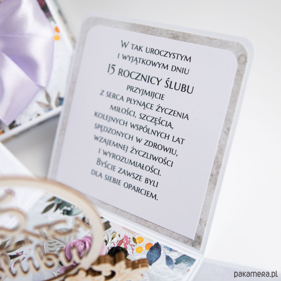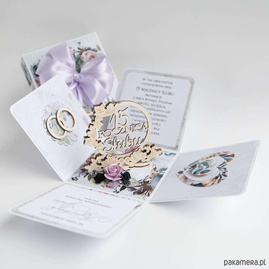 Ręcznie robiona kartka z okazji 15 rocznicy ślubu w formie rozkładanego pudełeczka.