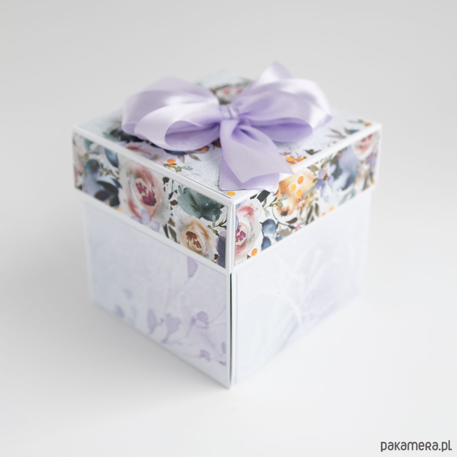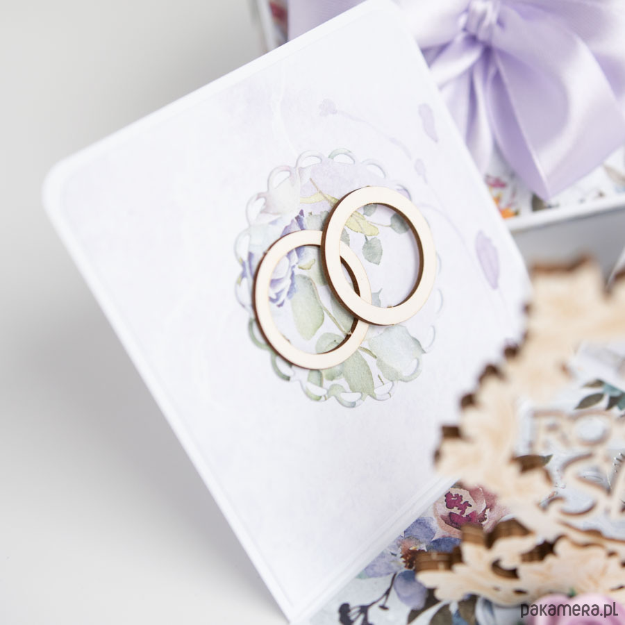 Na środku pudełeczka znajduje się dekoracja z papierowymi kwiatuszkami, na ściankach motyw serca, życzenia dla solenizantów, miejsce na podpis oraz splecione ze sobą obrączki.