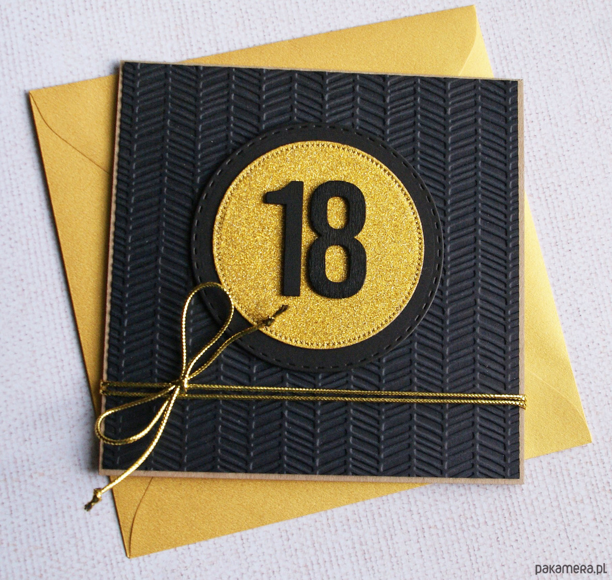 wykonana na bazie grubego kartonu EKO-kraft (100% makulatury), ozdobiona czarnym, fakturowanym przeze mnie papierem . liczba 18 - czarna, drewniana - umieszczona na brokatowym elemencie przestrzennym.