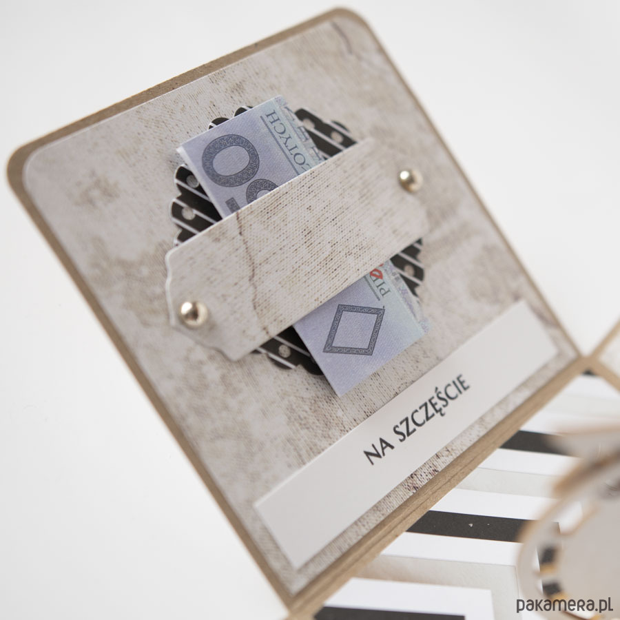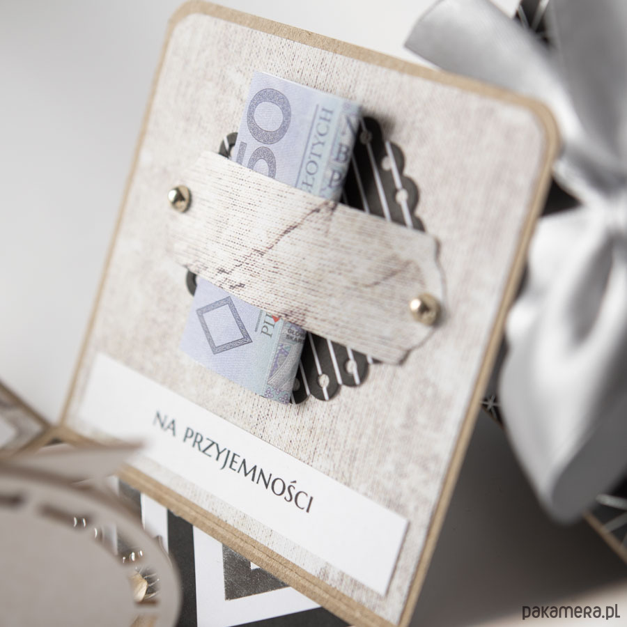 Na środku pudełeczka znajduje się dekoracja z papierowymi kwiatuszkami, na ściankach życzenia dla solenizanta oraz miejsca na banknoty (składa się je i wsuwa za specjalne "kieszonki", które znajdują się nad napisami na każdej ze ścianek).