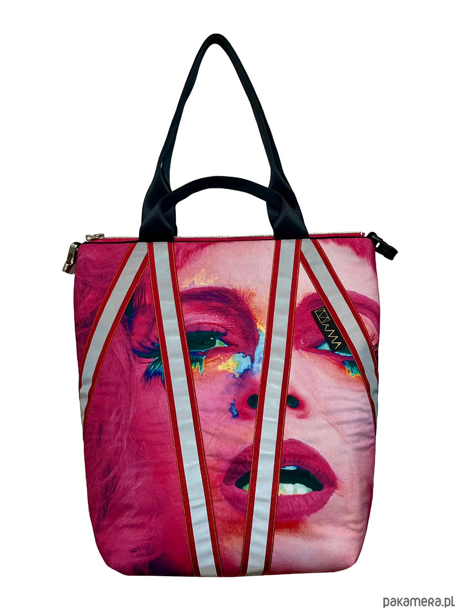 torba z printem pracy Szymona Kurpiewkiego, można prać w 30*C, można prasować, wykonana w jednym niepowtarzalnym zestawieniu zamków i taś fluo, dwie możliwości zapinania, zamek / zatrzask, trzy kieszenie wewnątrz, wymiar 46x56 cm, uszy wykonane z pasów samochodowych...