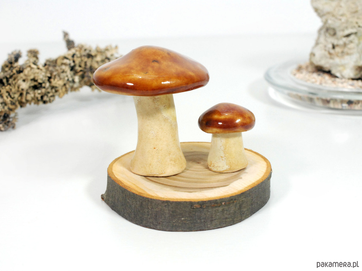 Zestaw zawiera - dwa ceramiczne grzybki w różnych rozmiarach + okrągła, drewniana podstawka do ich ustawienia.