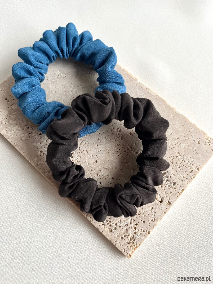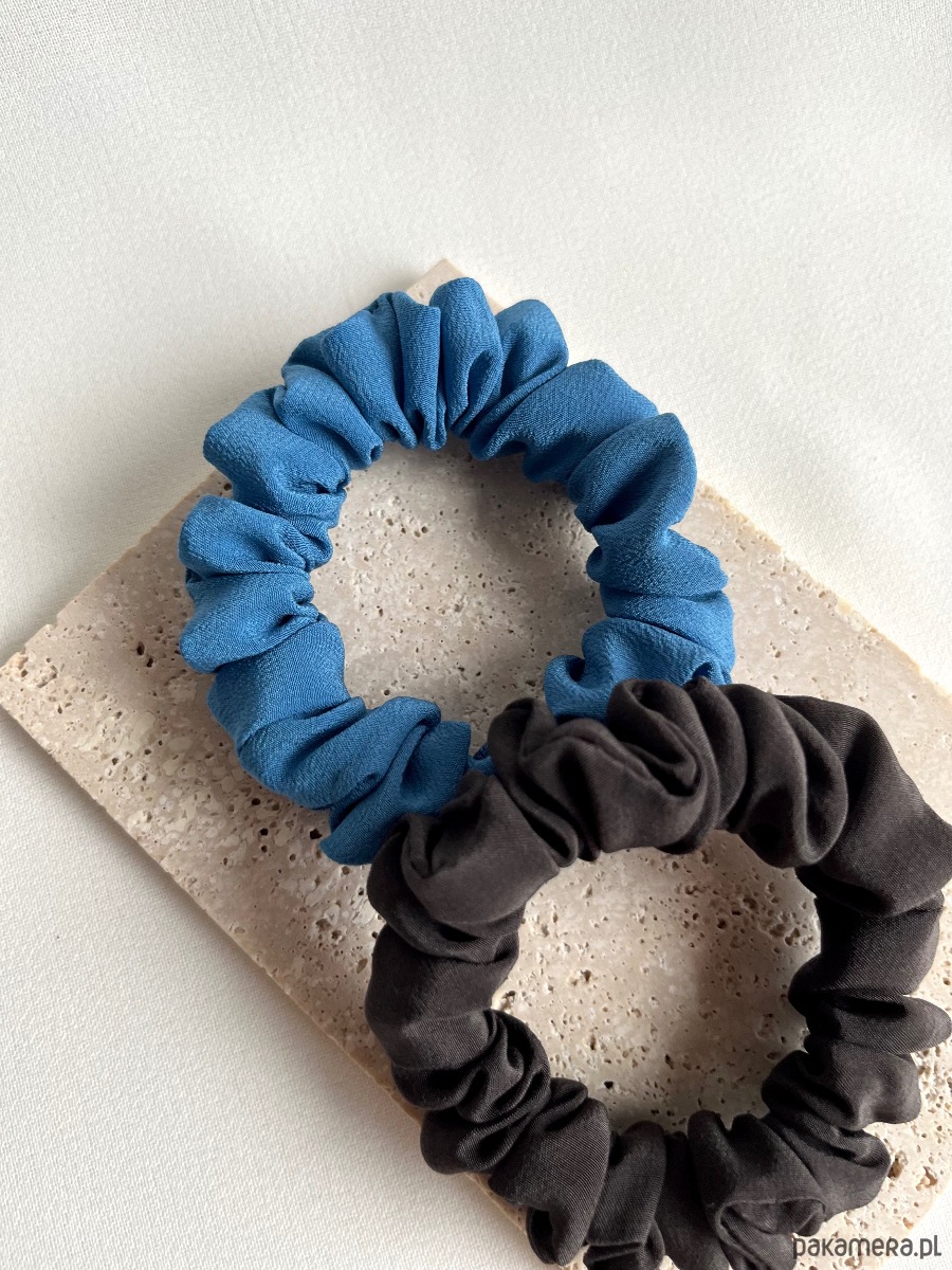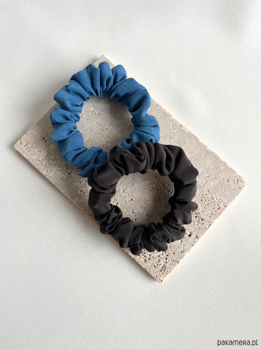 Zestaw 2 jedwabnych gumek scrunchies w wersji mini to duet idealny dla miłośniczek stonowanych, delikatnych akcentów. W zestawie scrunchies w kolorze niebieskim oraz brązowym.
