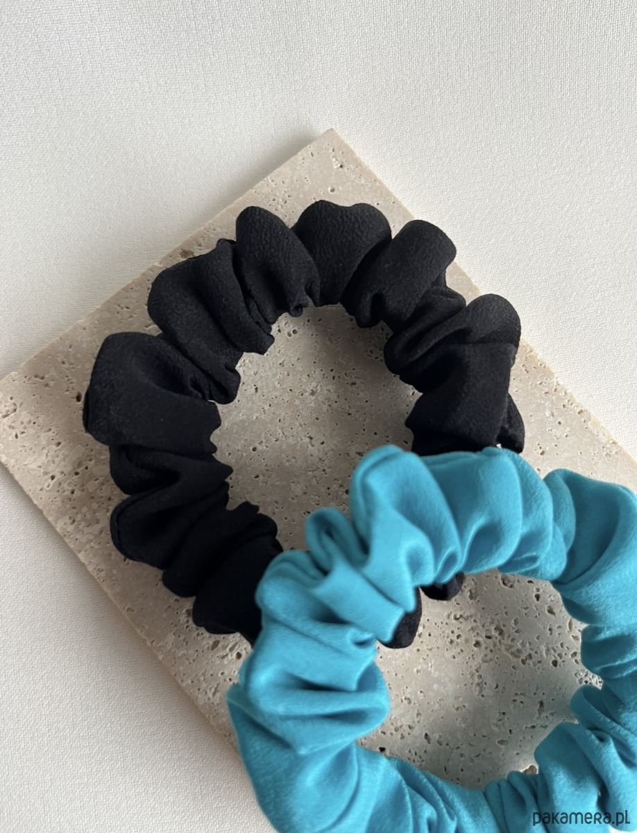 Zestaw 2 jedwabnych gumek scrunchies w wersji mini to duet idealny dla miłośniczek stonowanych, delikatnych akcentów. W zestawie urocza gumka Jackie w wyjątkowym niebieskim odcieniu oraz czarna gumka Black Silk.
