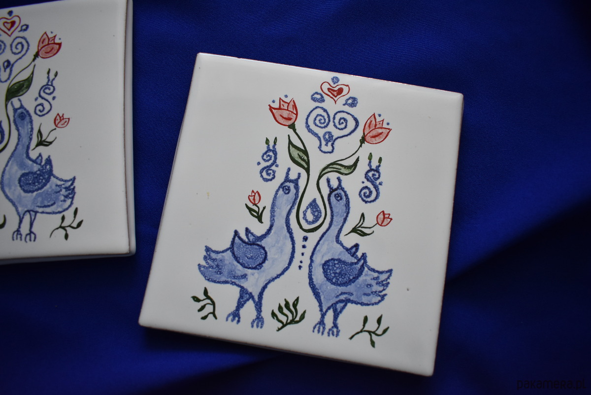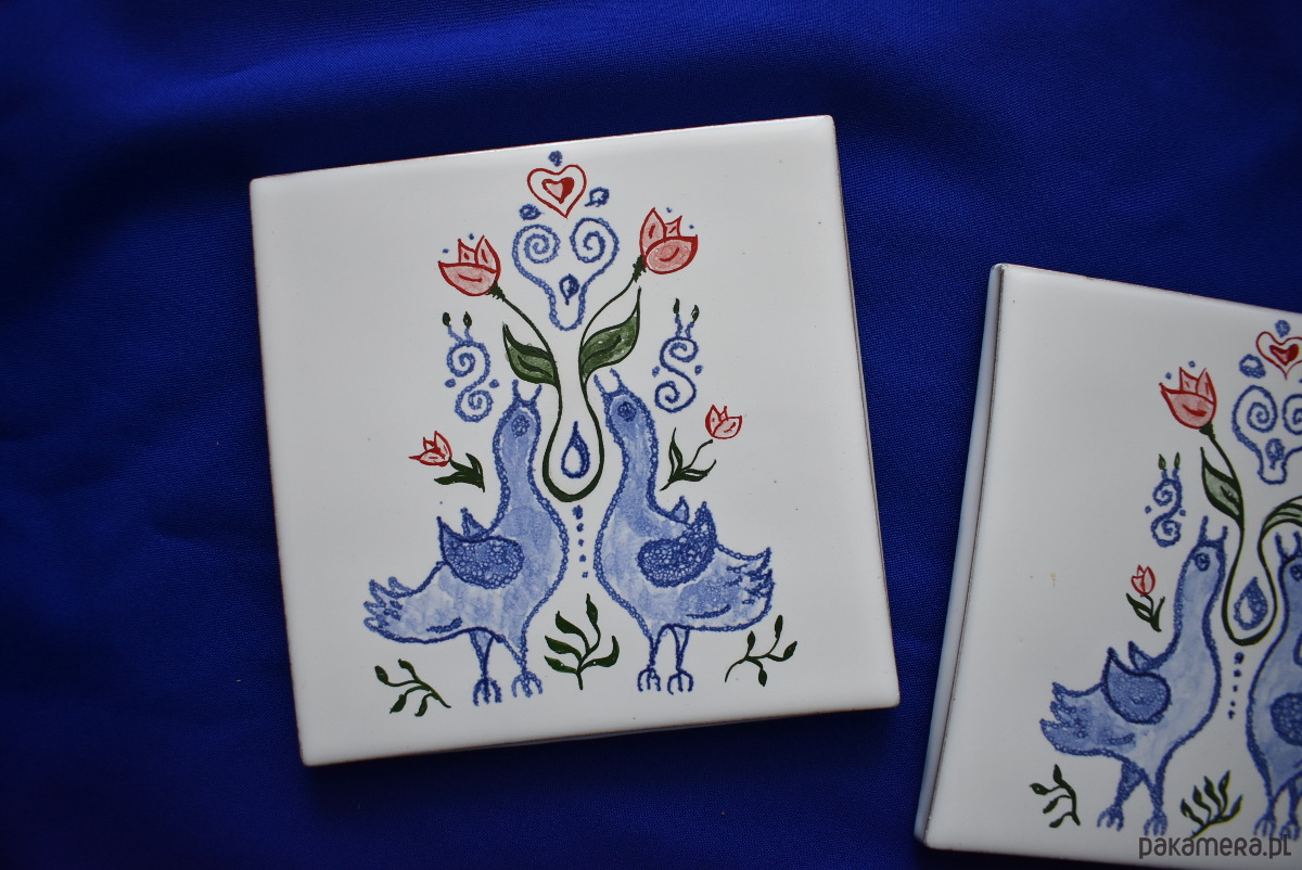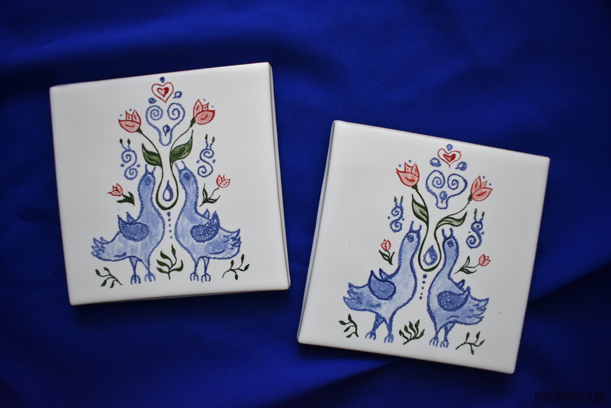 Płytki malowane w mojej pracowni mogą stanowić samodzielną ozdobę jako obrazki do powieszenia na ścianie, jako podkładka lub do przyklejenia na ścianę. Dzięki wypaleniu w wysokiej temperaturze wzór nie ściera się podczas mycia.