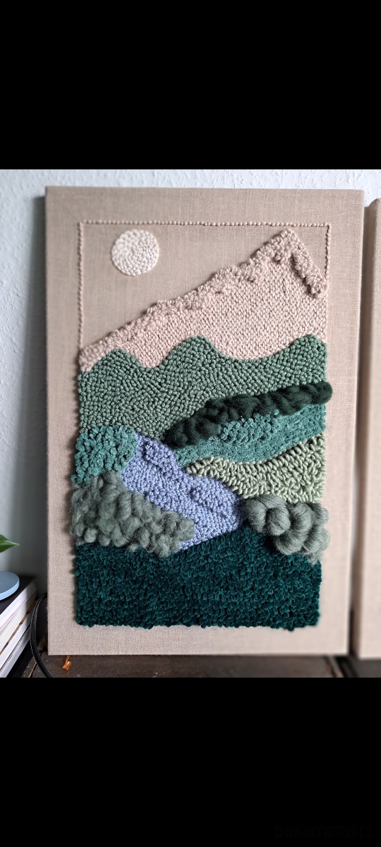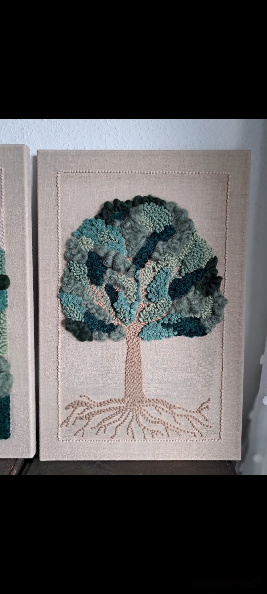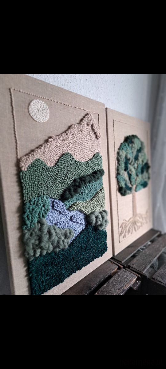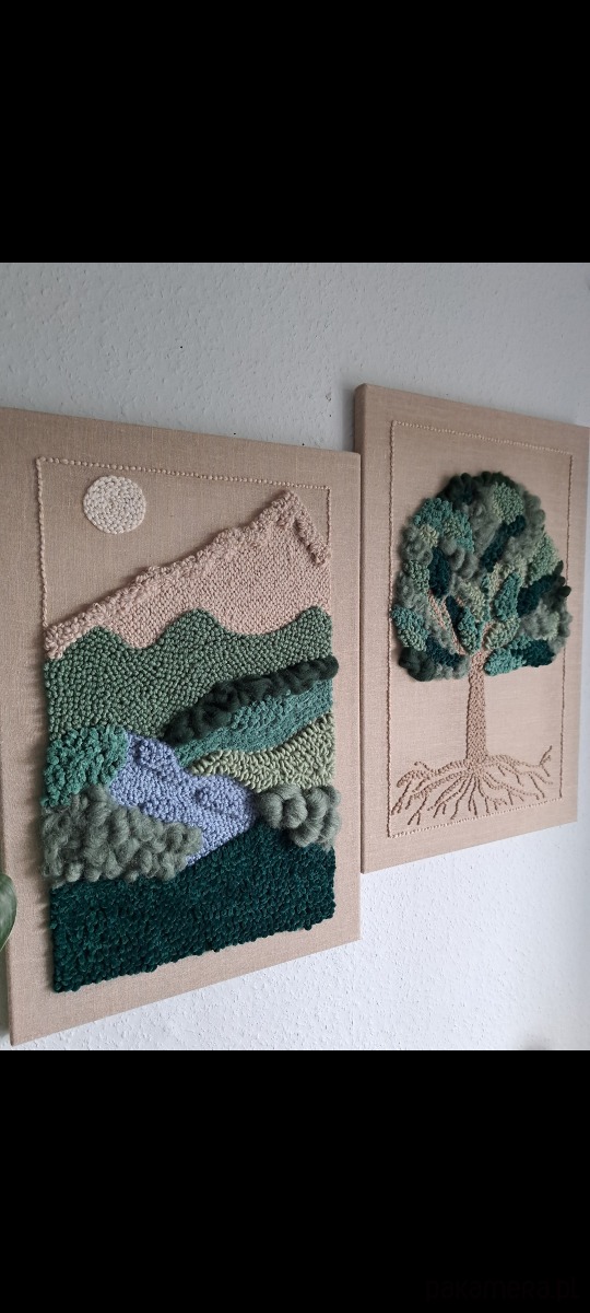 Dwa obrazy 40x60cm w zielono beżowych odcieniach. Pierwszy z motywem gór i rzeki, drugi to drzewo życia.