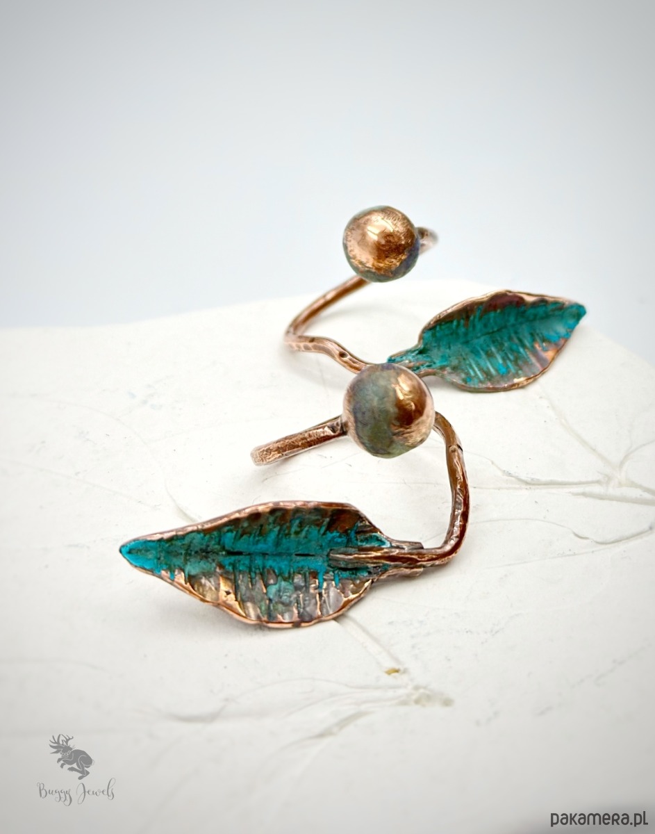 Dwa Zwariowane Pierścionki, wykonane ręcznie z miedzi, która została pokryta turkusową patynką, a następnie specjalnym woskiem jubilerskim oraz lakierem, dla dłuższego utrzymania efektu. 2 pierścionki tworzą komplet , nadając wyrazu oraz oryginalności.