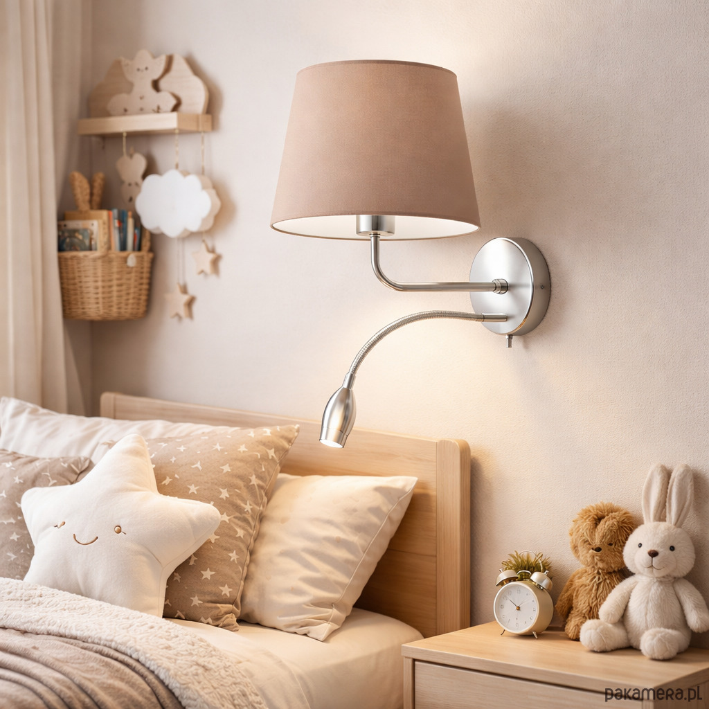 Kinkiet IMPERIA będzie idealną dekoracją do pokoju Twojego dziecka. Oświetlenie nie tylko potowarzyszy Twojemu maluchowi podczas wieczornej zabawy ale także w czasie zasypiania. IMPERIA to niezwykle funkcjonalny model. Oświetlenie poza miejscem na klasyczną żarówkę posiada ruchomy panel LED, który można nakierować w dowolnym kierunku. Lampę wykonano używając najwyższej jakości komponentów. Stelaż lampy stanowią elementy metalowe zaś jej abażur wyprodukowany został z holenderskiej tkaniny tekstylnej podklejonej na folii PVC.