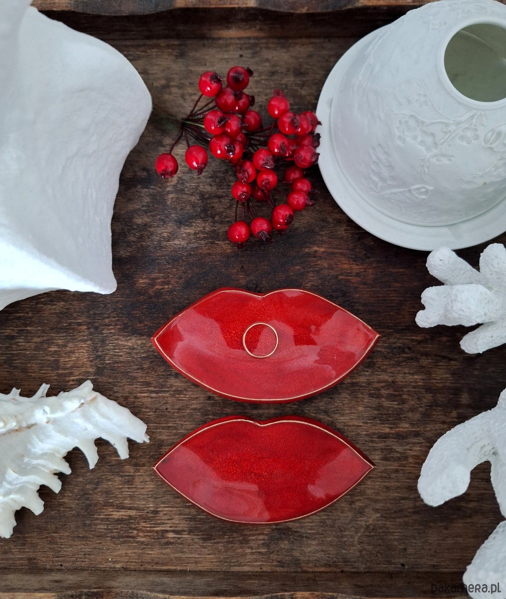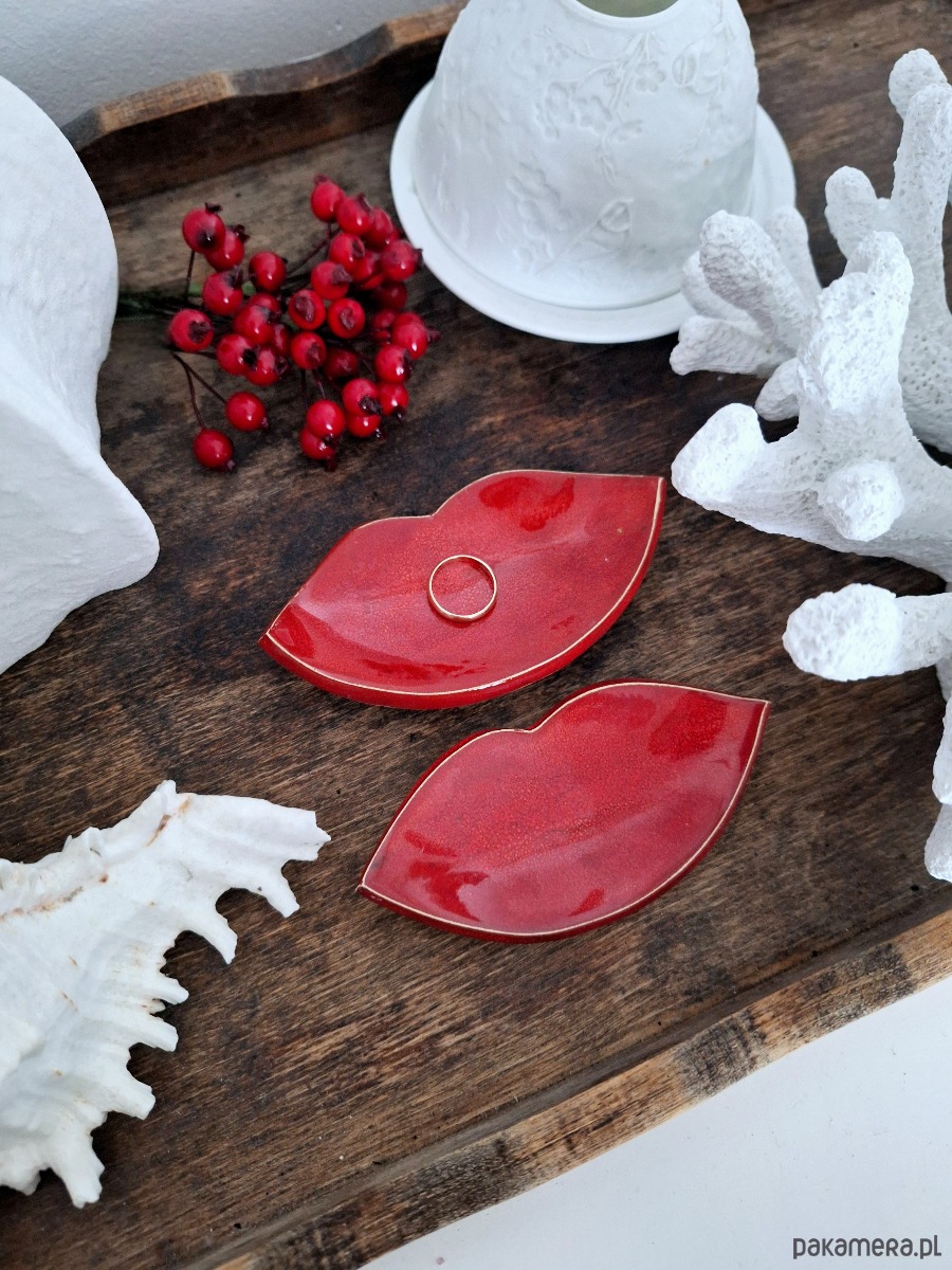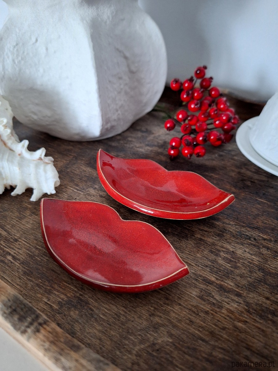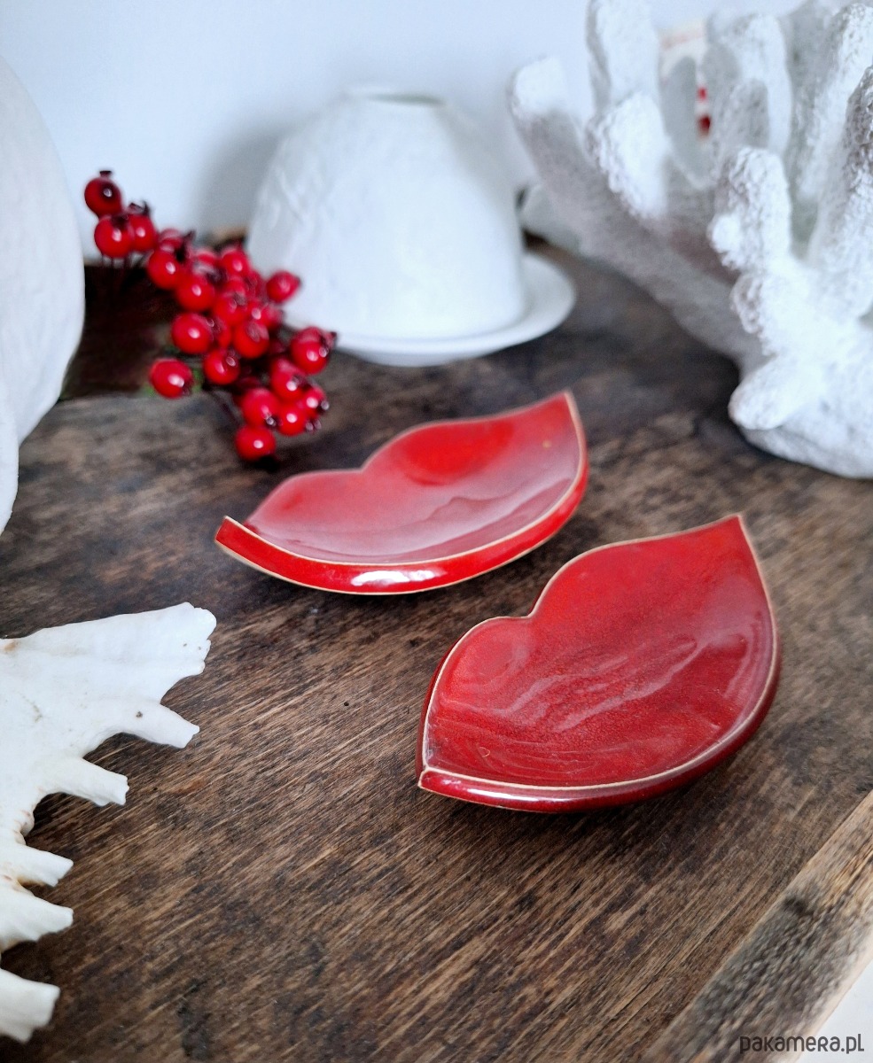 Ceramiczne dekoracyjne podstawki w kształcie ust w kolorze głębokiej czerwieni. Dekoracja ręcznie formowana i szkliwiona.
