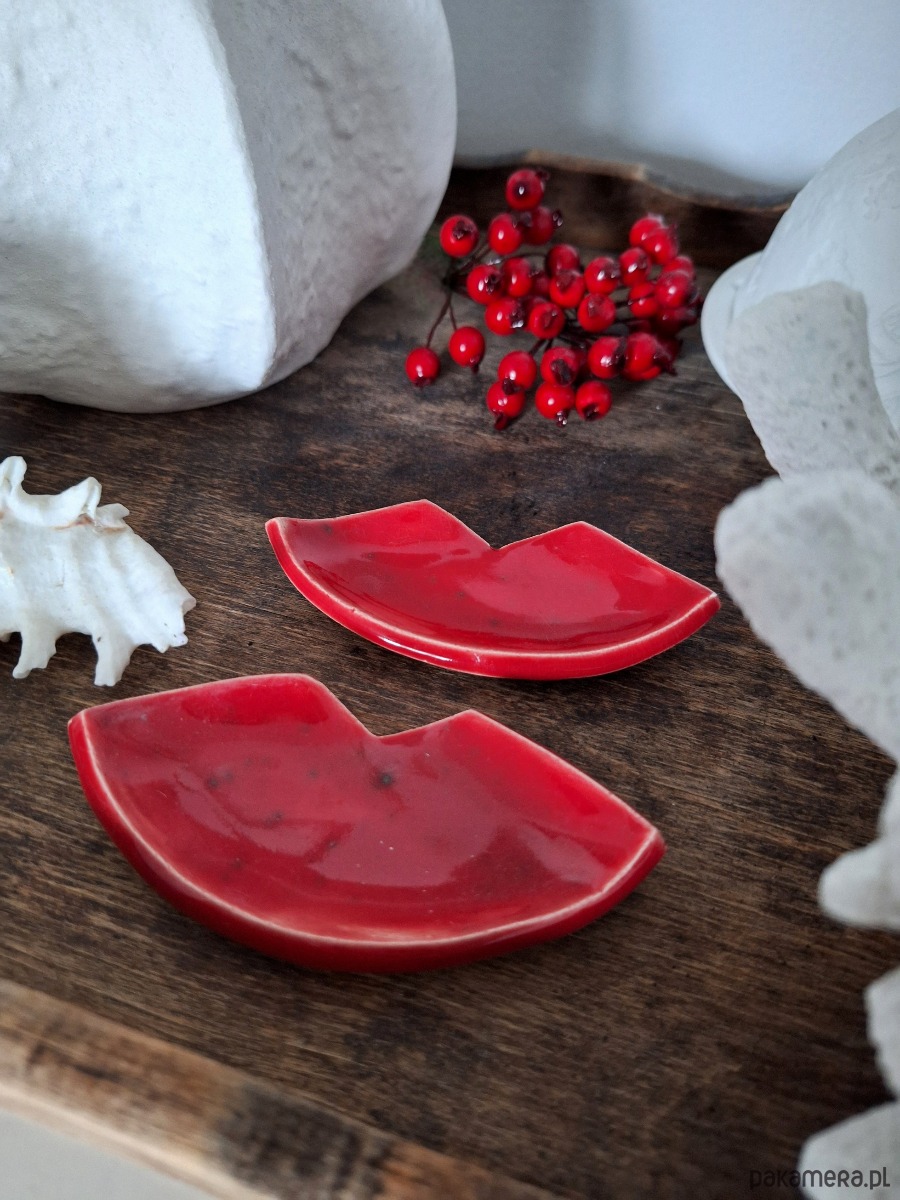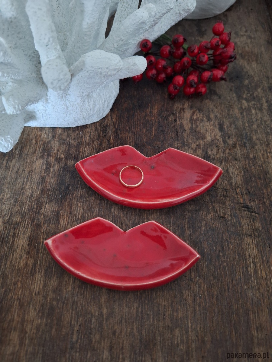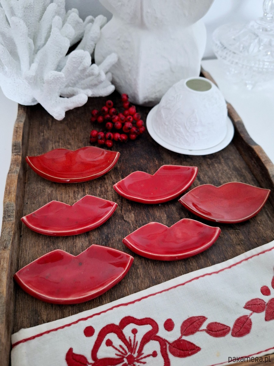 Ceramiczne dekoracyjne podstawki w kształcie ust w kolorze głębokiej czerwieni. Dekoracja ręcznie formowana i szkliwiona.
