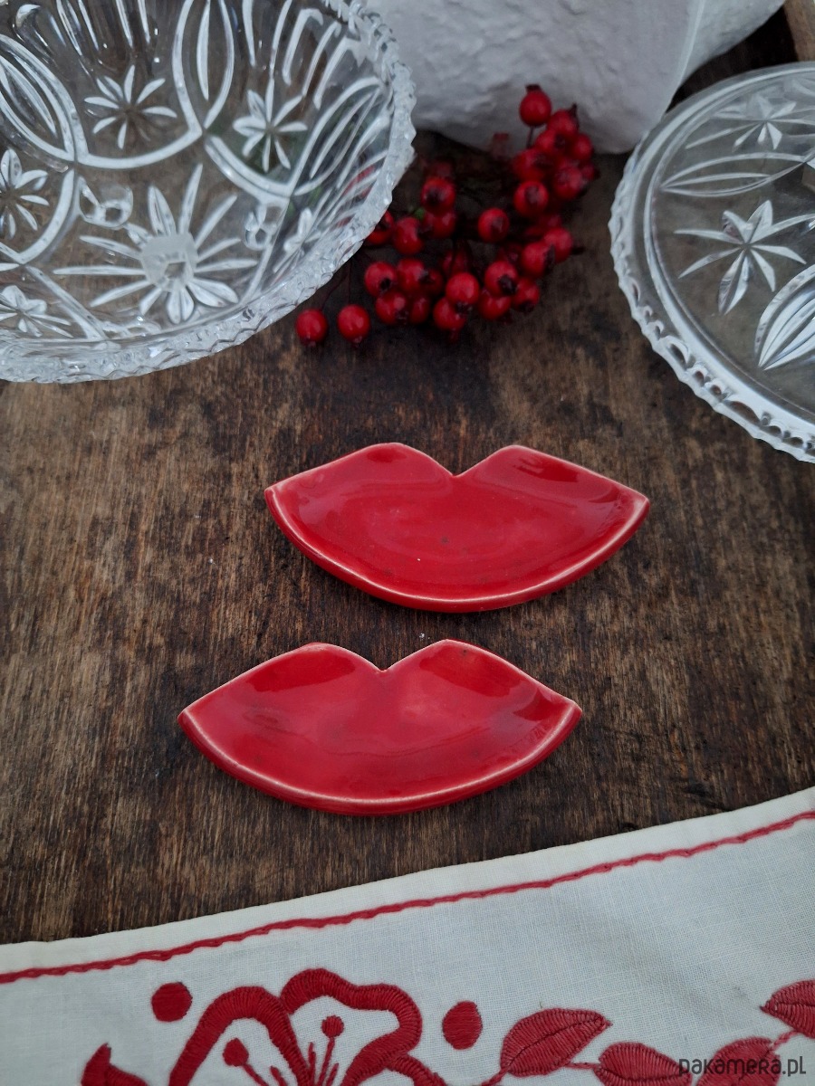 Ceramiczne dekoracyjne podstawki w kształcie ust w kolorze głębokiej czerwieni. Dekoracja ręcznie formowana i szkliwiona.