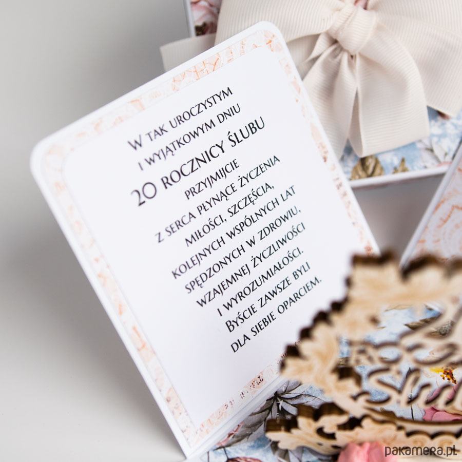 Ręcznie robiona kartka z okazji 20 rocznicy ślubu w formie rozkładanego pudełeczka.